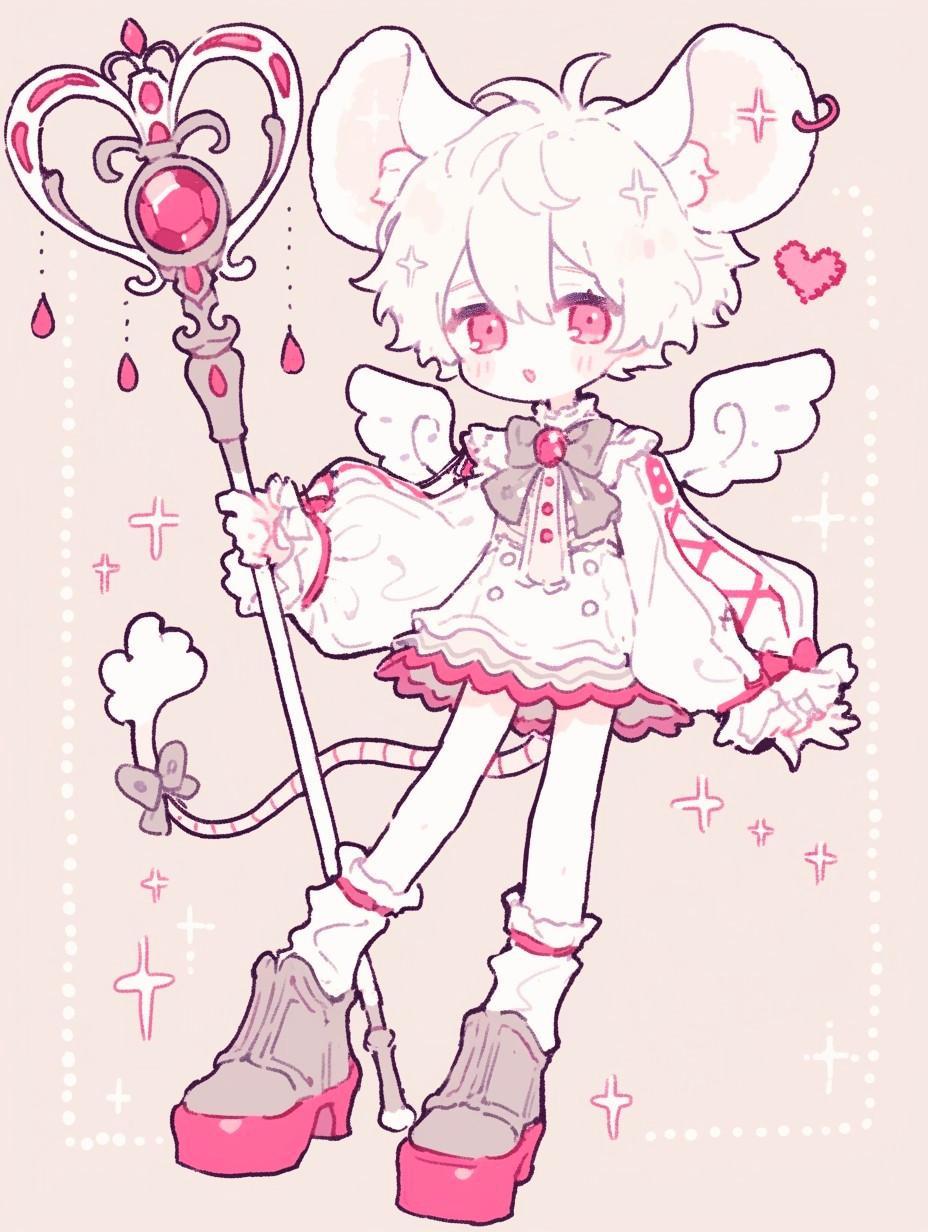 rat ears Girl, kawaii, chibi, cute girl, Whole body, fairy, Magical girl, hold magic wand with drop shape red jewels, white short hair, Pale pink fluttering one-piece dress, pale pink frill clothes
