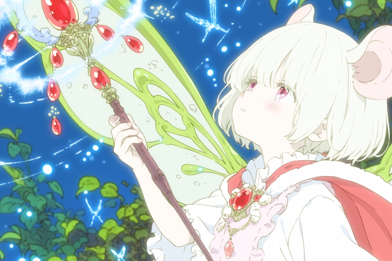anime screen Capture, rat ears girl, High quality, anime screen Capture, cute girl, Magical girl, hold magic wand with drop shape red jewels, white short hair, Pale pink fluttering one-piece dress, pale pink frill clothes