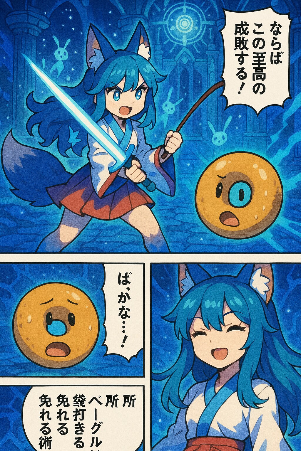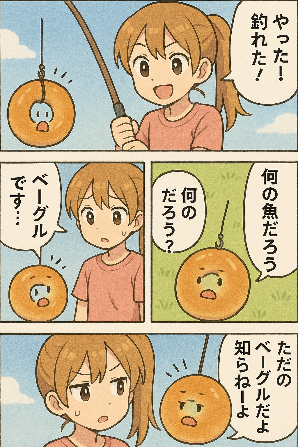 ・ベーグルというアイテムが、釣りの対象として扱われながら意思を持っているというメタな設定が、作品全体の「ズレ感」を演出しています。
