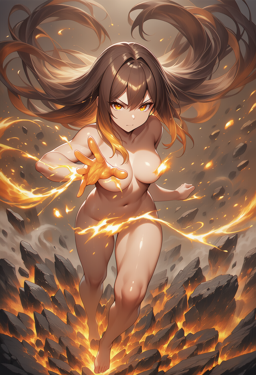girl, young adult, medium breast,magical girl transformation, ong flowing hair, ash brown with golden amber highlights, tips shaded dark chestnut, eyes glowing amber gold with faint olive green rings, determined gaze, healthy slightly tanned skin, earth element, glowing brown and golden aura, girl standing powerfully, right foot stepping forward and pressing firmly into cracked ground, left leg extended back for balance, right arm thrust forward with palm open, glowing earthen energy swirling, left arm stretched backward, fingers tense, eyes narrowed with fierce determination, gaze fixed ahead, head slightly tilted downward as if glaring with resolve, 1.3::earth element energy wave::