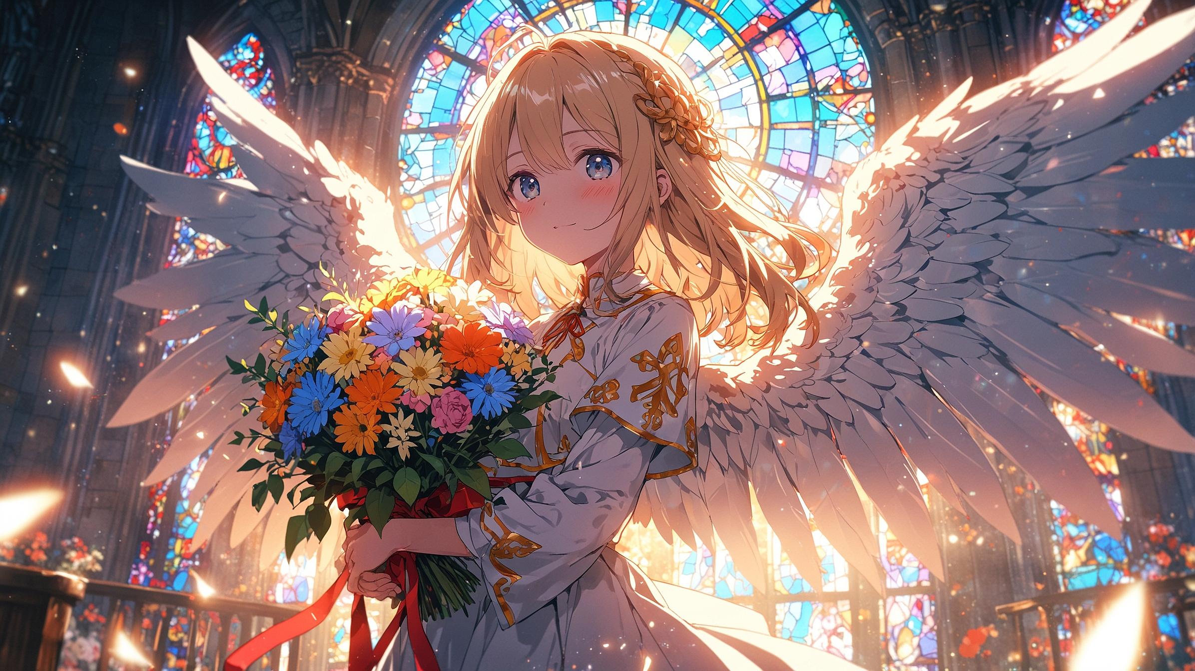 金色の光が差し込む聖堂で、天使は小さな花束を手渡そうとしている。