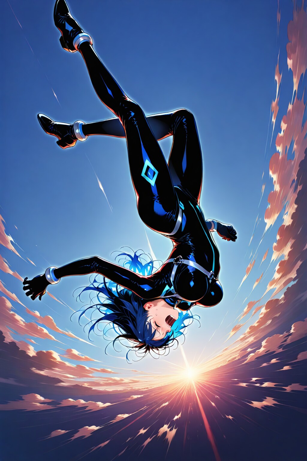 松本美月(落下中、叫び声): 「うわ! 怖い!」 [彼女は体を硬直させ、アクロバティックな動きを試みるがすぐに諦め、安定した姿勢で落下を続ける。]