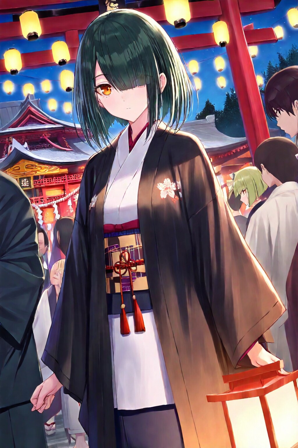 (Hairstyle Details:hair Dark green hair,bob cut hair,hair medium hair,hair over one eye),expressionless,eyes beautiful eyes orange eyes,full body,barefoot,toe