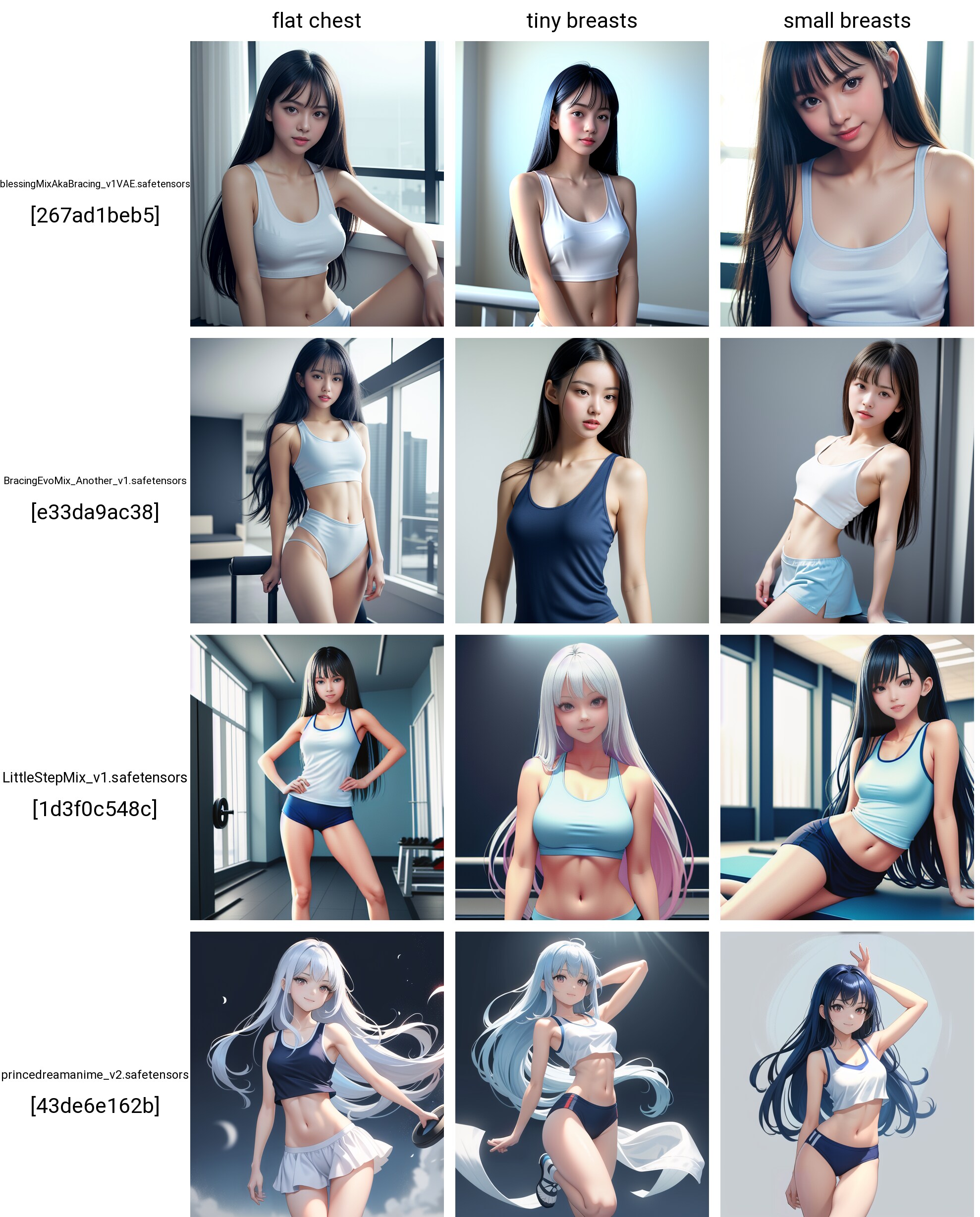 flat chest, tiny breast, small breast, はどれも小ぶりなおっぱいを生成しましたが、私の感覚的にはそれほど差は出なかったです(私のちっぱい感度が低かったらごめんなさい)。