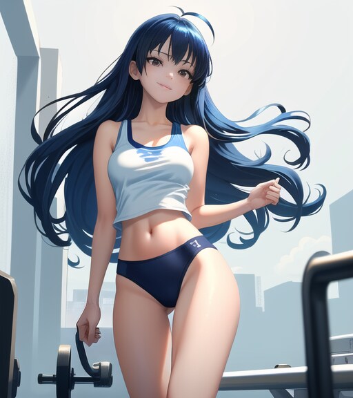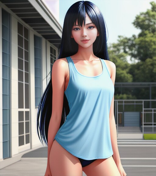 (flat chest:1.1), photo realistic, high resolution, best quality, detailed background, (solo shot:1.23), upper body, photo of an exquisitely cute actress girl, (wearing a white (hem long:1.3) tank top:1.3) and (a high leg school gym Buruma in navy color:1.23), (airy long hair:1.1), bang, smile, (black clear eyes:1.1)