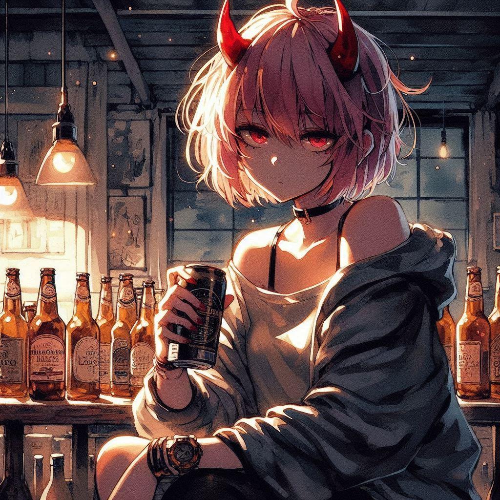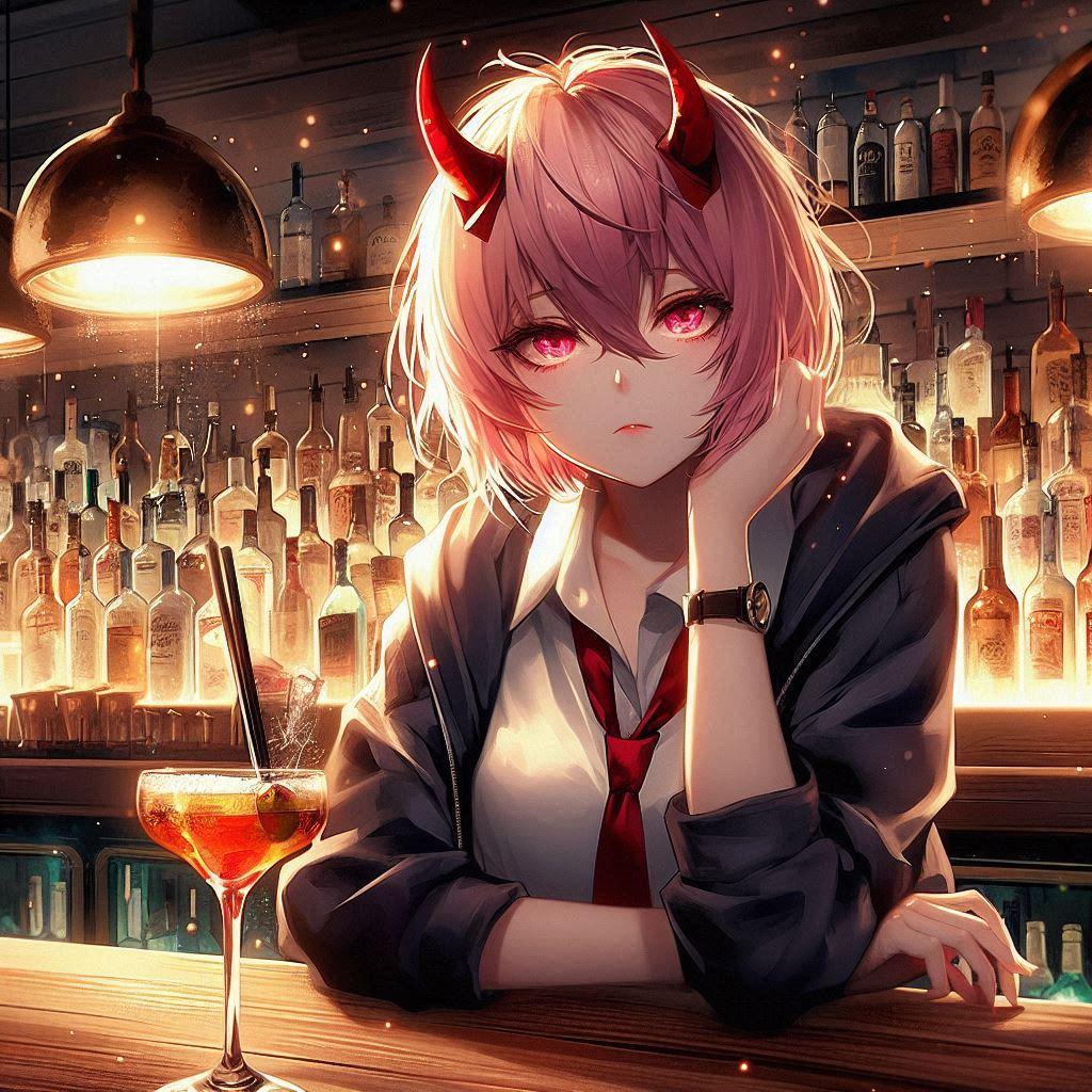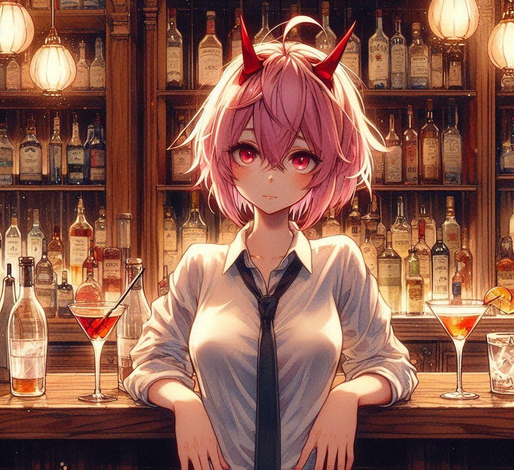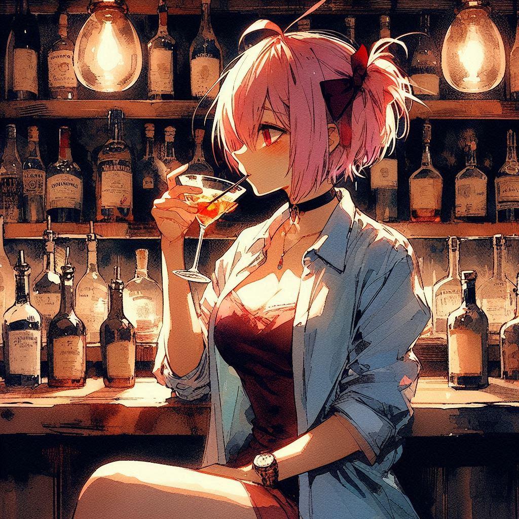 自室とバー、2か所で飲んでいる怠惰ちゃんを生成してみました。自室だと気が抜けたのか、より気だるい感じになってくれたのが良い感じに出せた気がしています(*´▽`*)