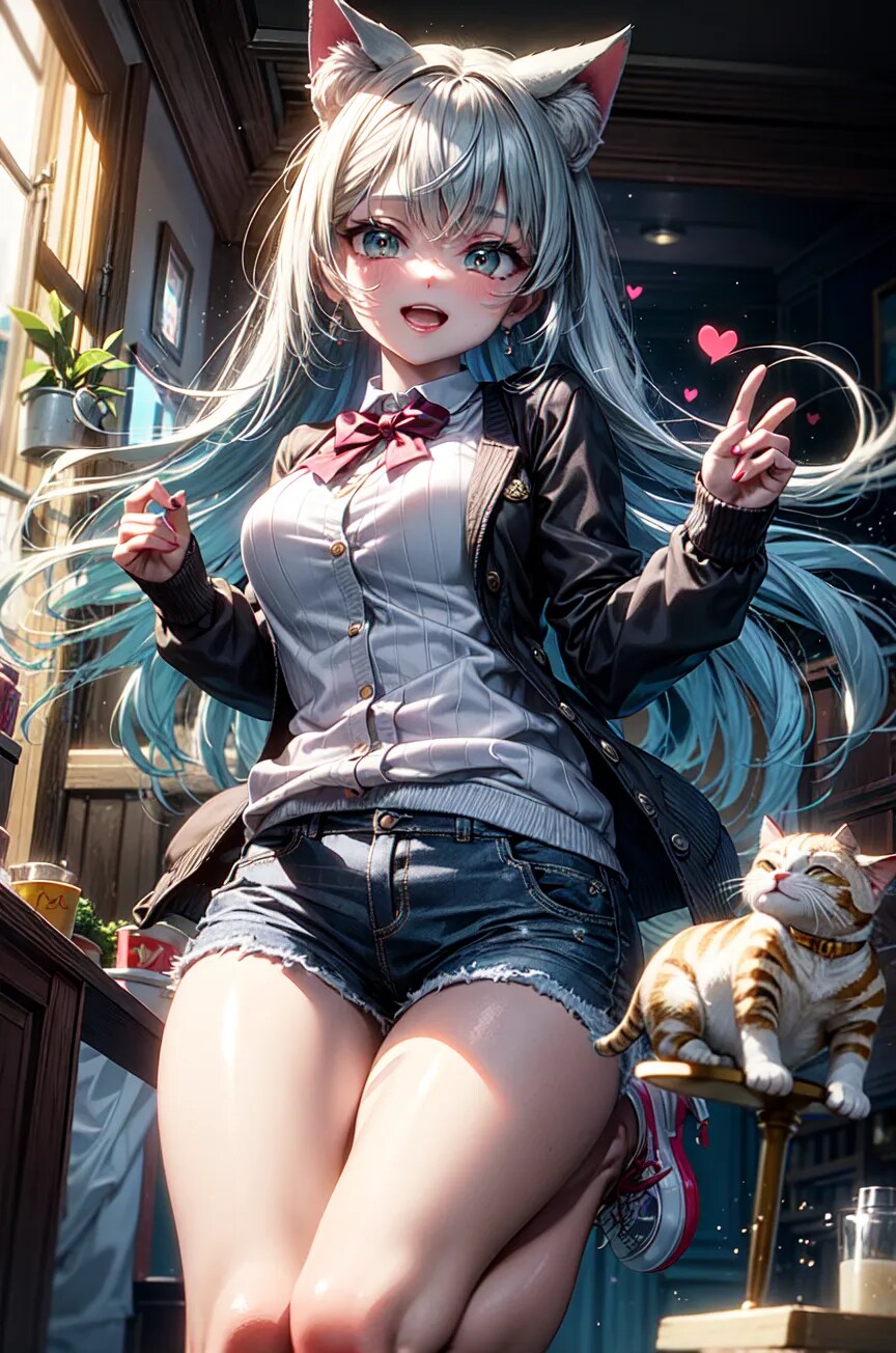 「はい!ピース!」猫カフェで楽しそうな猫耳ちゃん