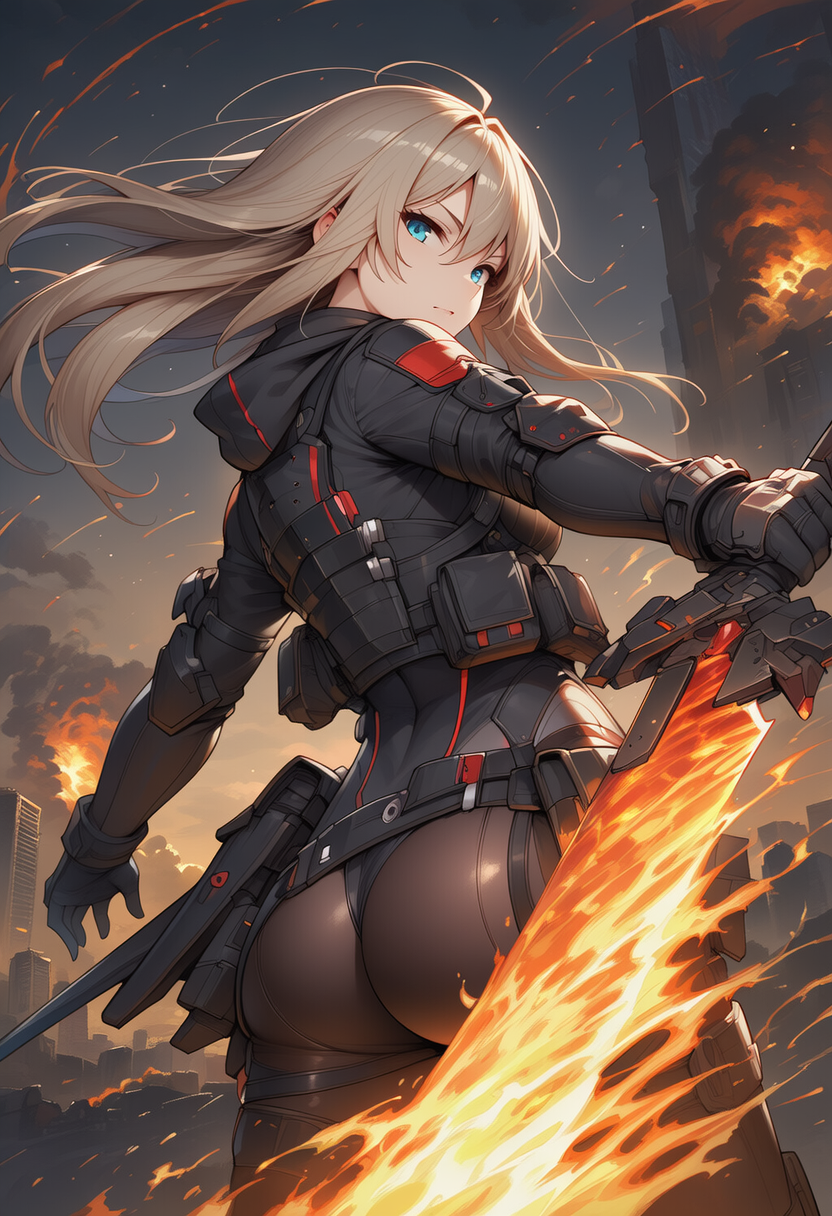 girl, high tech equipment, fire sword, blazing fire, swinging sword down,
