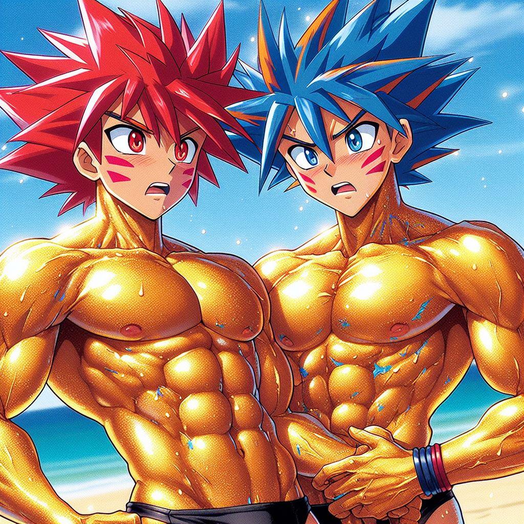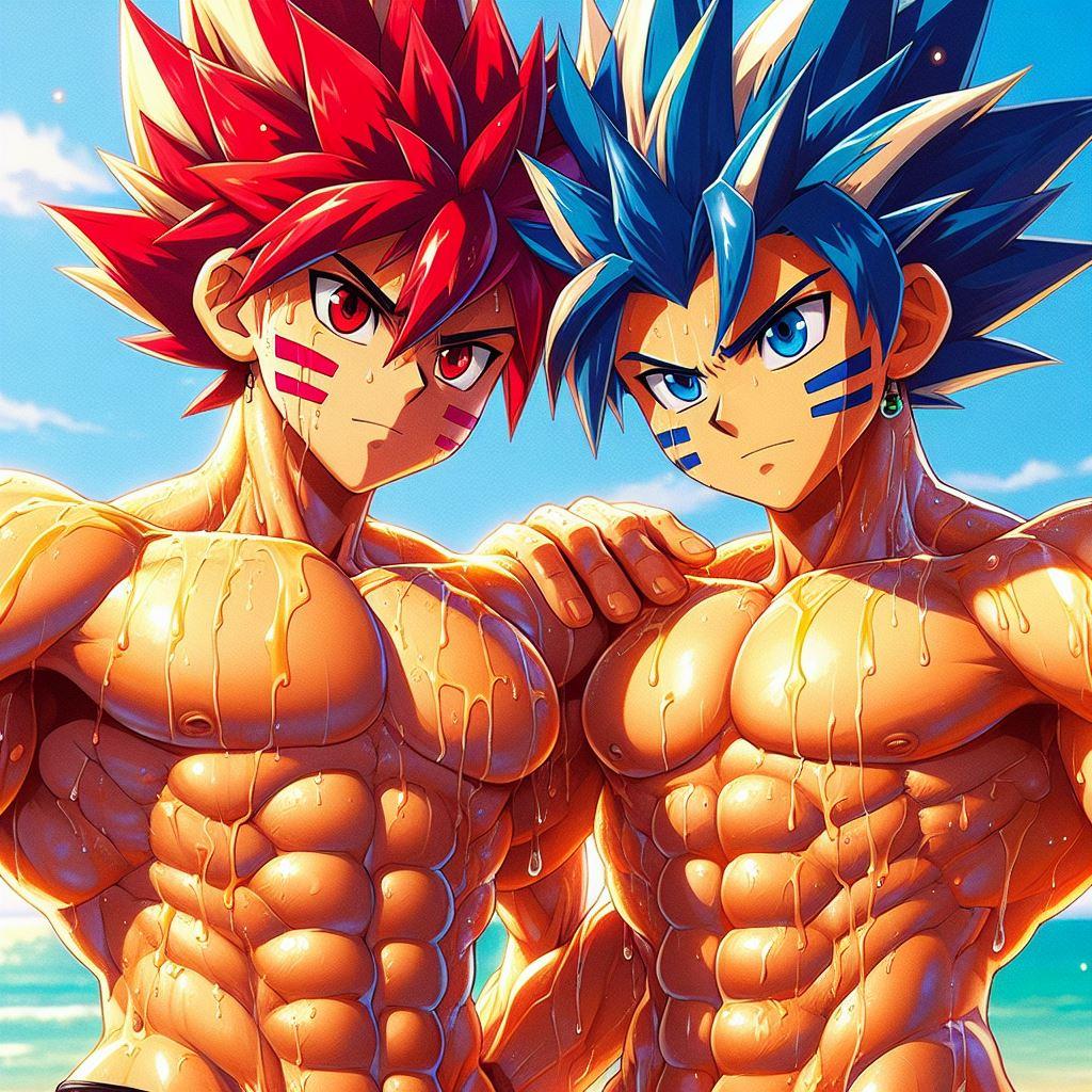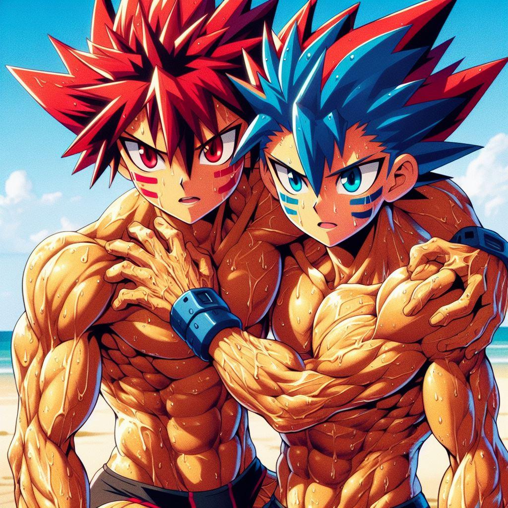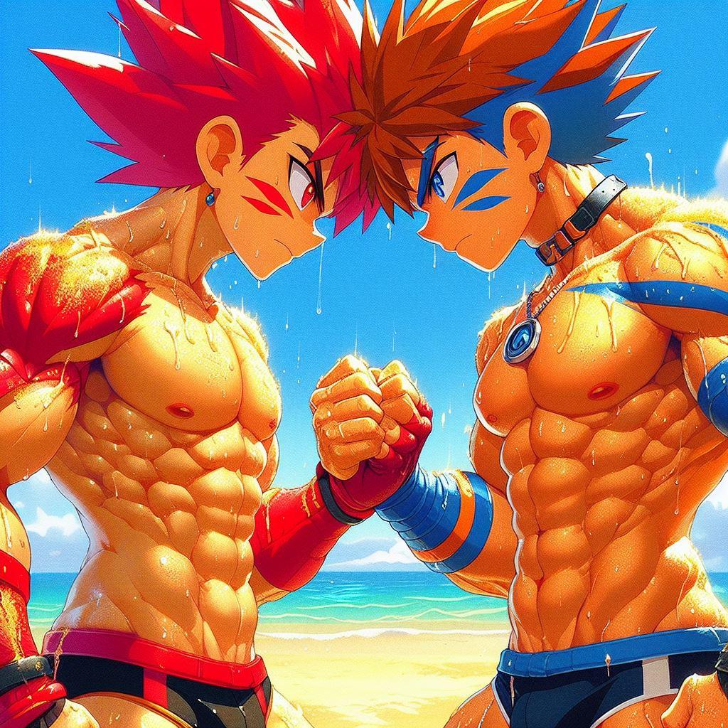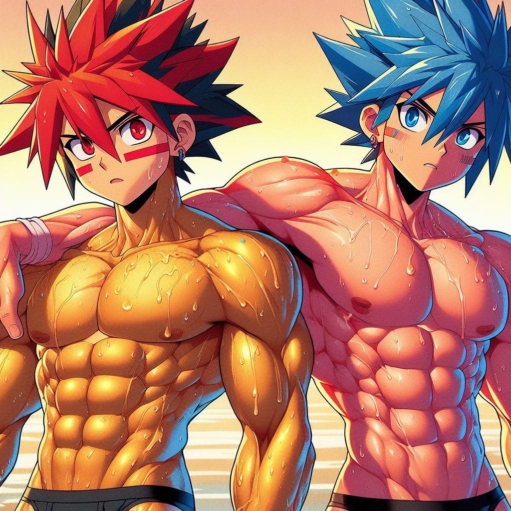 タケルの赤い髪が太陽に輝き、オレの青とオレンジの髪が海の色を反映している。体を鍛えることが好きだし、一緒にいる時間が一番楽しい。だけど、時々オレは不思議な感情に戸惑うことがある。タケルと抱き合ったとき、それがただの友情なのか、それとも…もっと深い何かなのか。オレたちはお互いを抱きしめても恥ずかしくない。