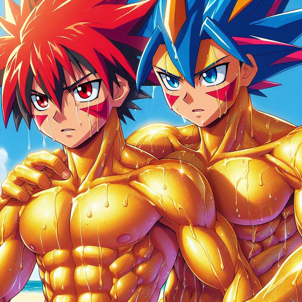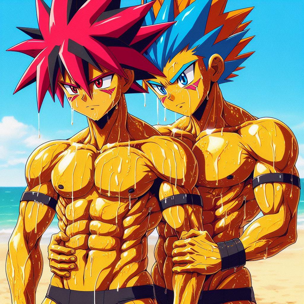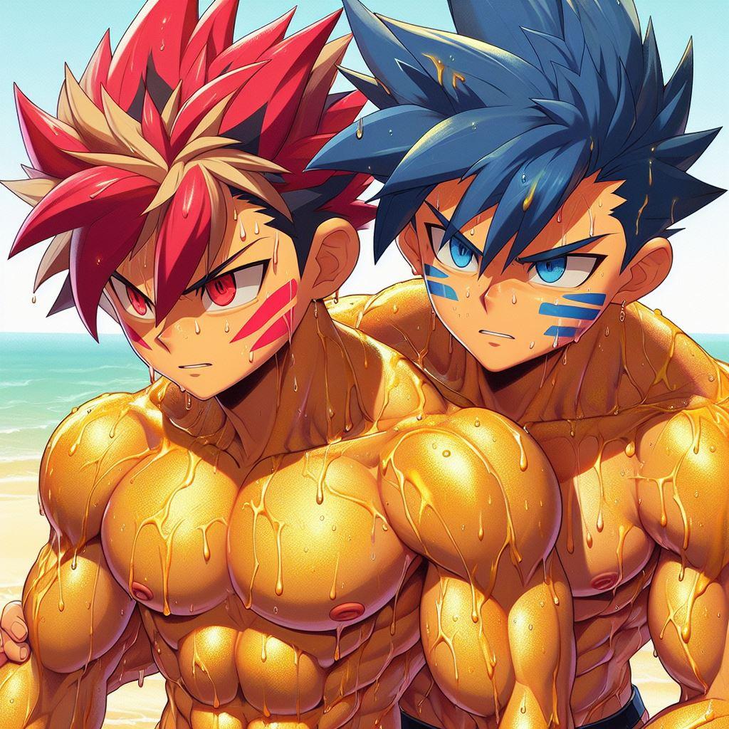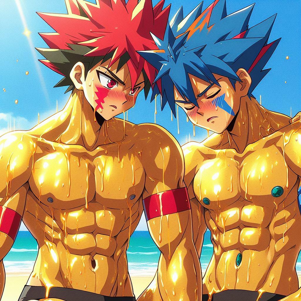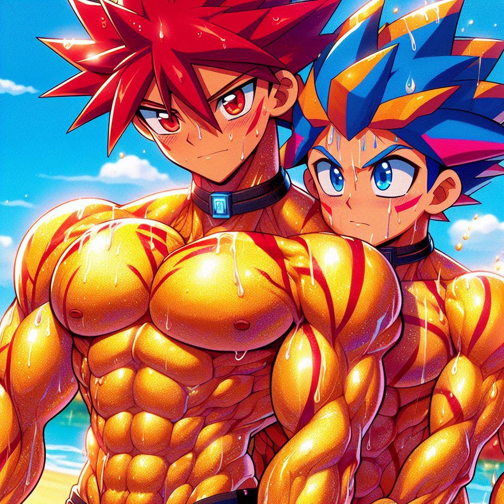 タケルの赤い髪が太陽に輝き、オレの青とオレンジの髪が海の色を反映している。体を鍛えることが好きだし、一緒にいる時間が一番楽しい。だけど、時々オレは不思議な感情に戸惑うことがある。タケルと抱き合ったとき、それがただの友情なのか、それとも…もっと深い何かなのか。オレたちはお互いを抱きしめても恥ずかしくない。