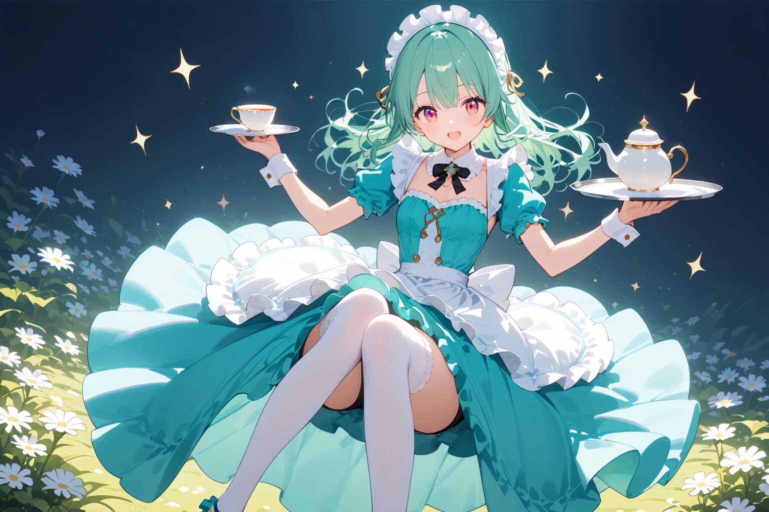 彼女は両手いっぱいのティーセットを持って歩く。