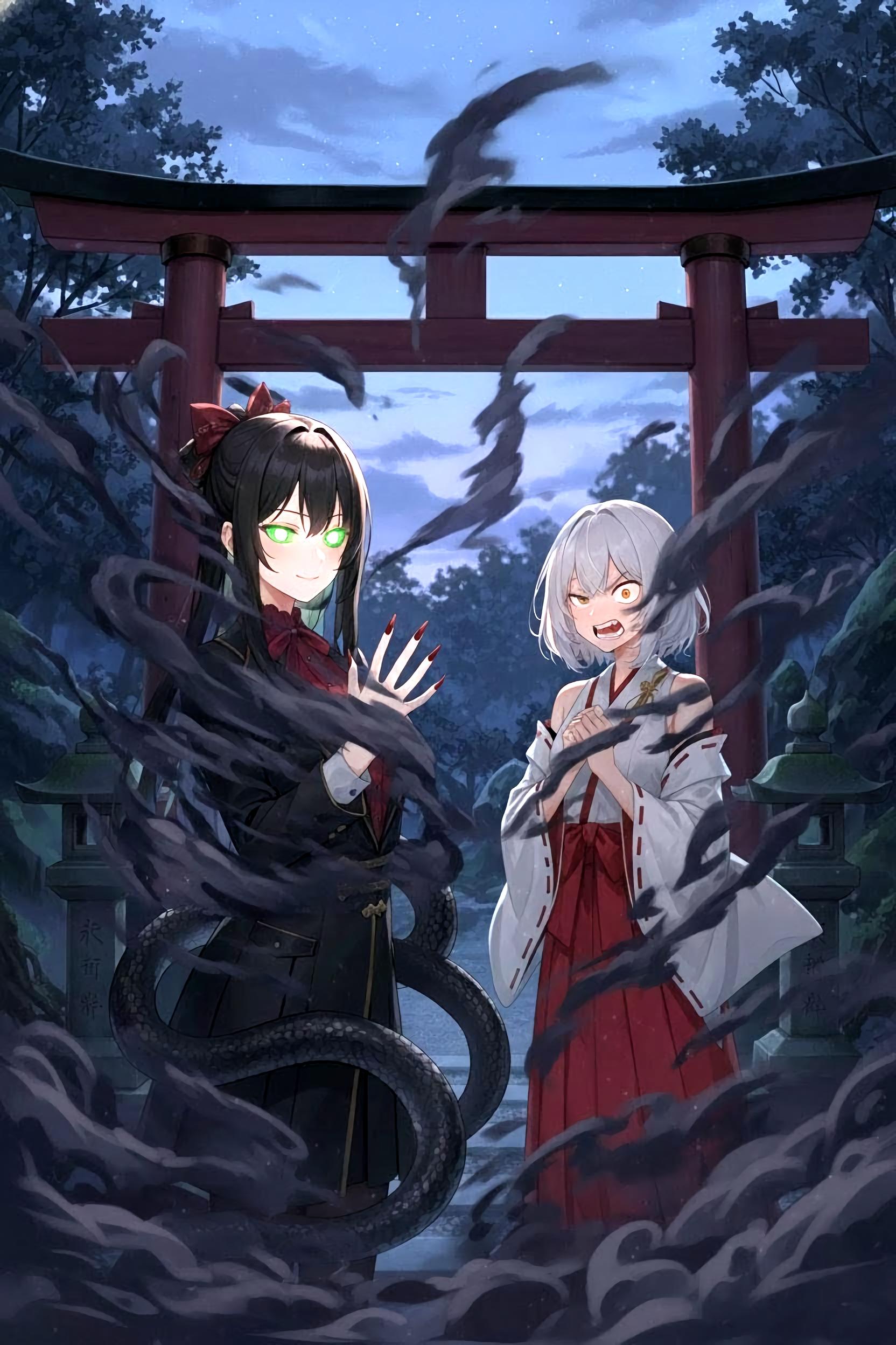 放課後、白蛇神社の境内。 ヘビ神様は自分の社(やしろ)に戻っていたが、そこには既に先客がいた。社殿の屋根に、黒蛇が不敵な笑みを浮かべて居座っている。