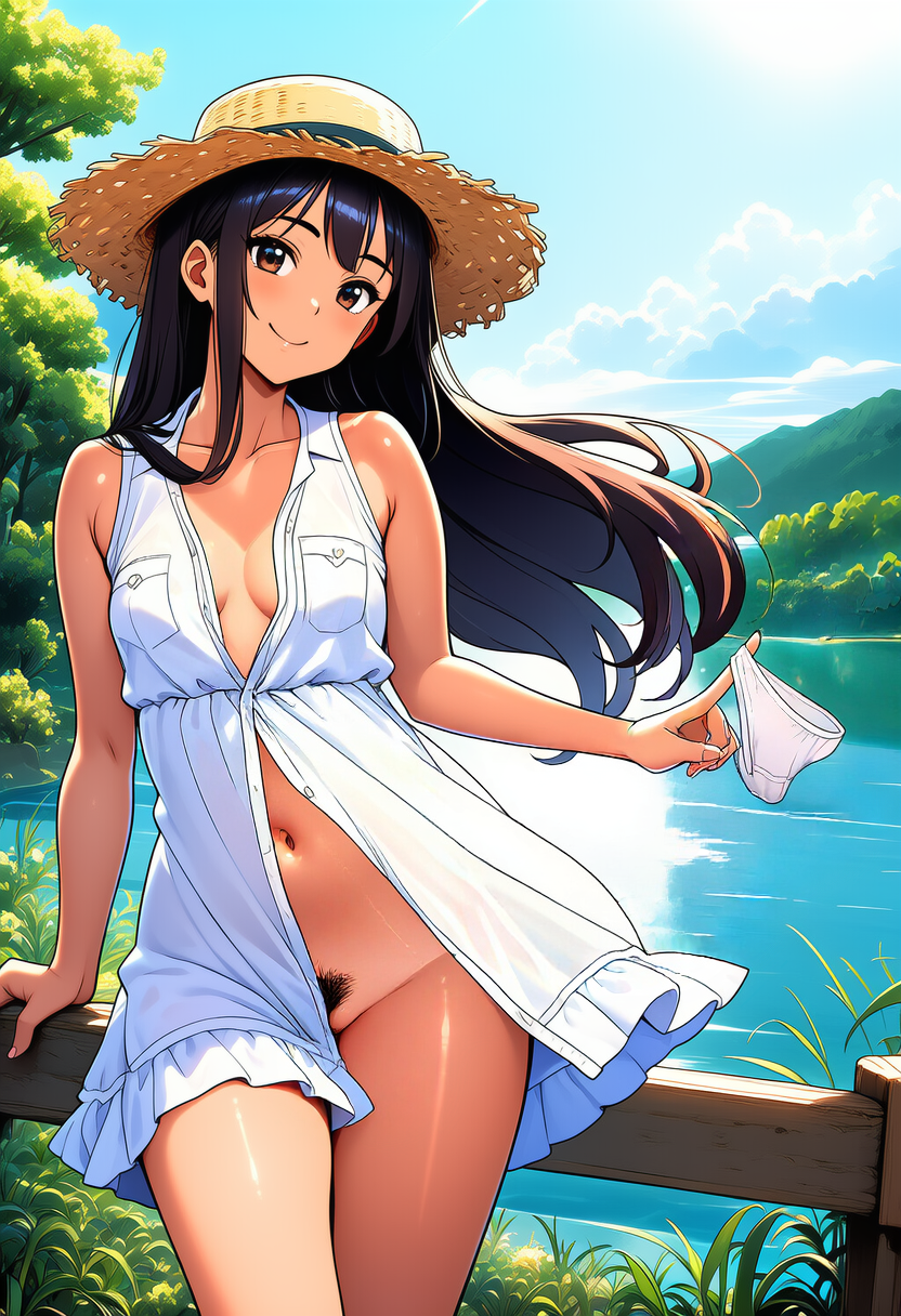 ④navel, rolling dress, opened dress,unbuttoned dress, collared dress, → ワンピースめくりあげ
