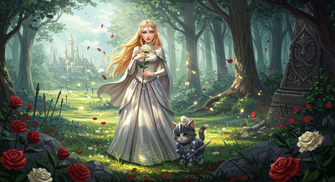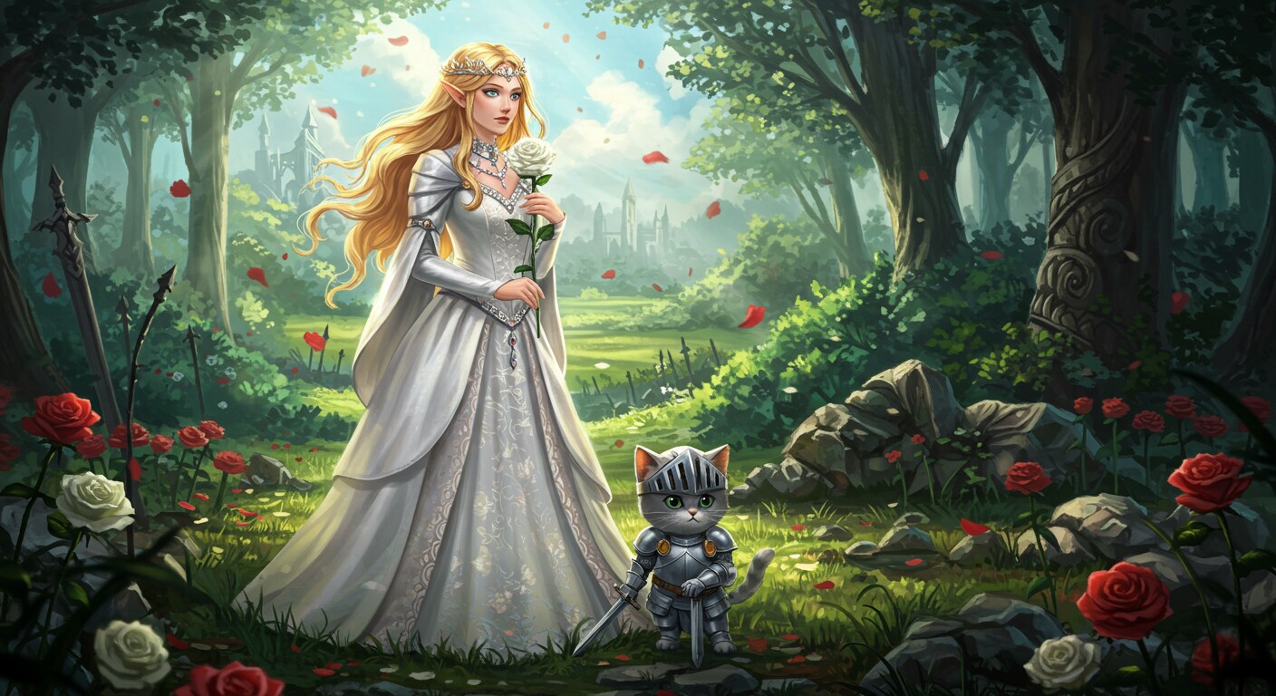 赤と白の薔薇が象徴する争いの時代、平和を願うエルフの姫君と、彼女を守る小さな騎士猫が森の奥で未来を見据える。