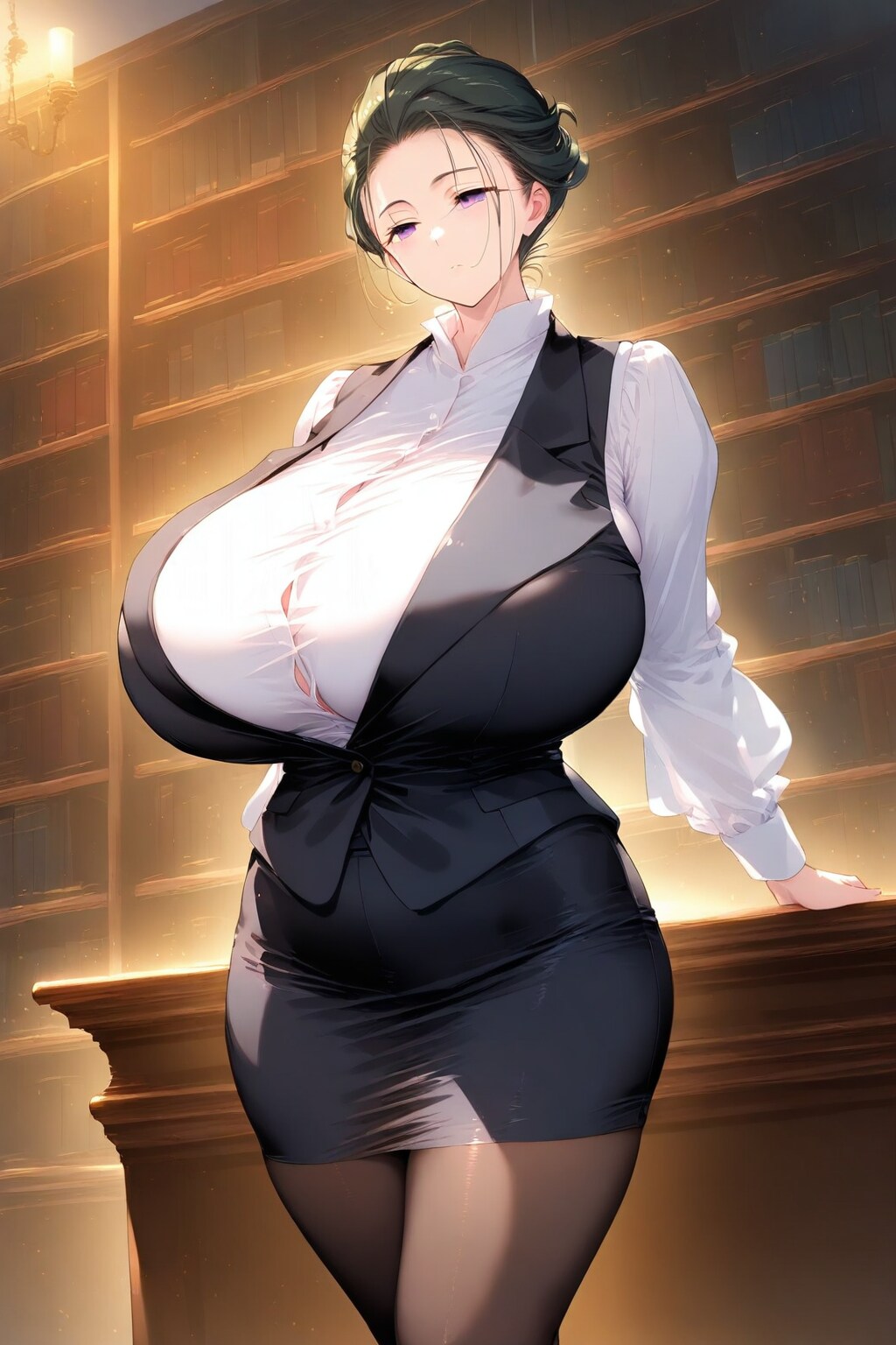 huge breasts, voluptuous body, gigantic breasts, dark green hair, short hair, mature female, hair slicked back, purple eyes, slanted eyes, (hair intakes forehead), thick thighs