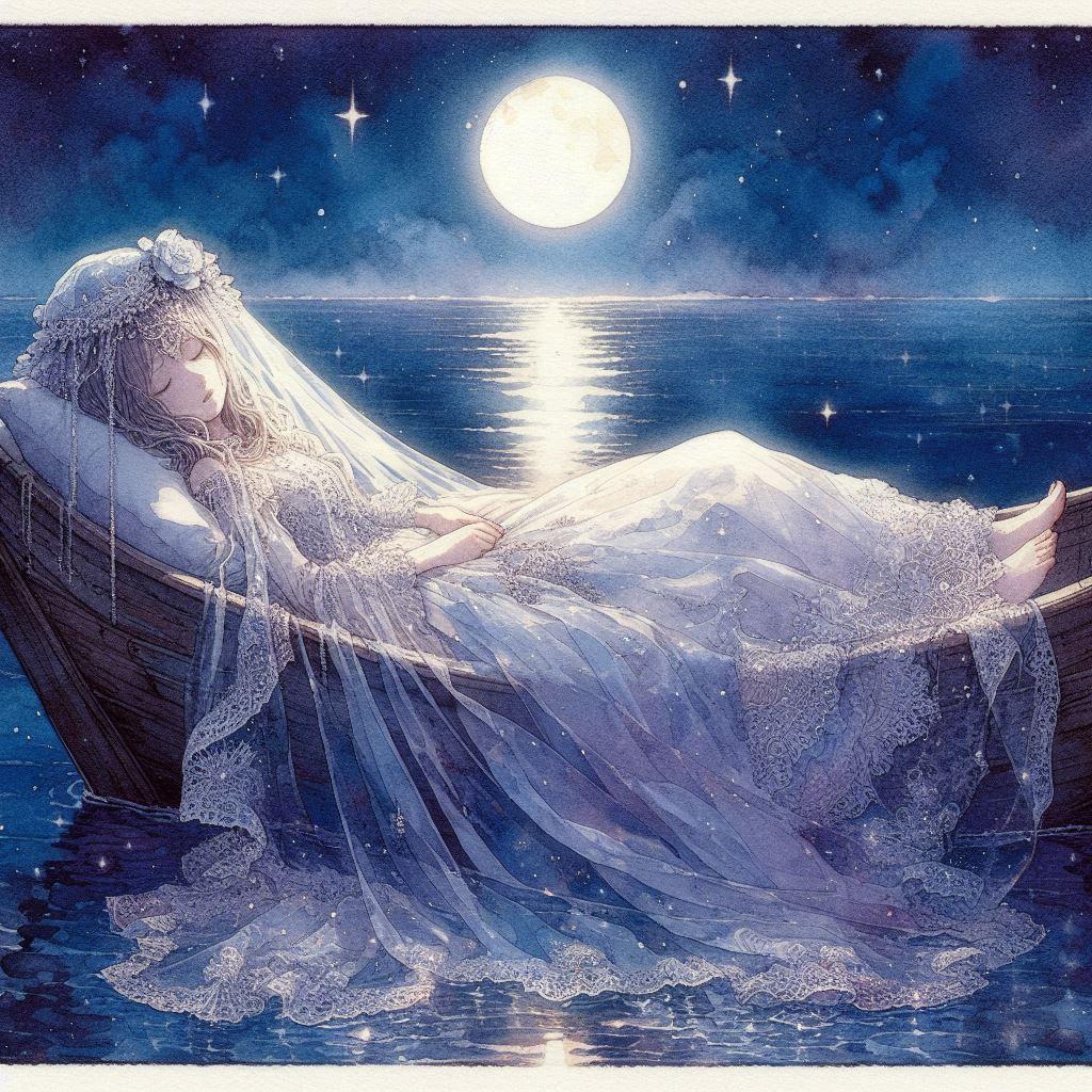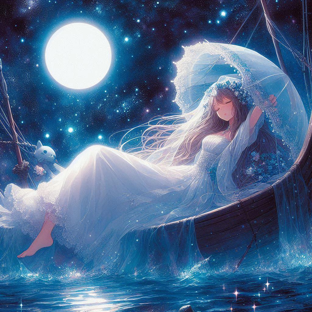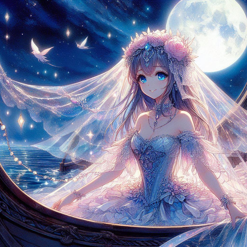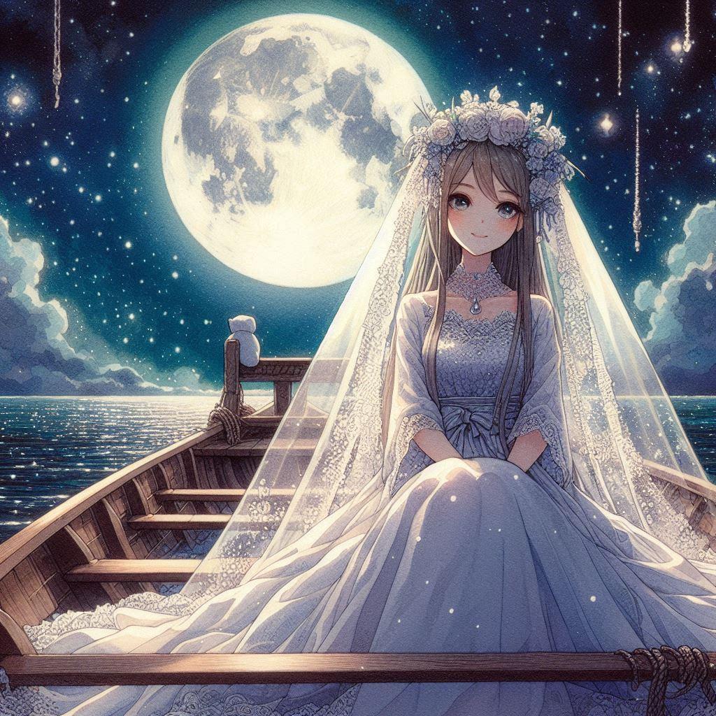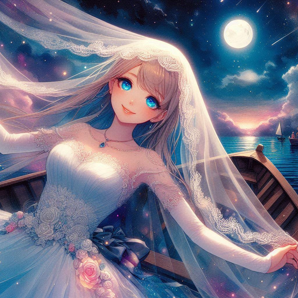 で、PVで全編に渡って登場する小船の上で、二人だけの結婚式を挙げている・・・という設定にしてみようと思い生成しました。