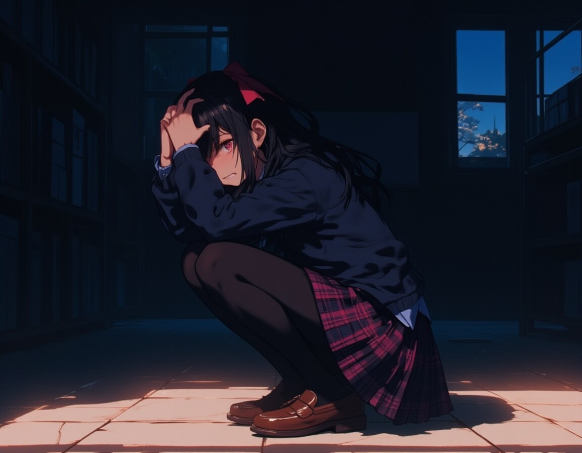 A highly detailed scene of an eight-year-old girl's entire body,crouched down,hands on her head,looking away in disappointment and sadness,seemingly in a hurry. She is pale,her mouth is wavy and she has a pained expression on her face. She has long bright black hair,a red ribbon and beautiful red eyes. She wears a navy cardigan over a pale blue collared shirt,a black and magenta tartan check pleated miniskirt,black pantyhose and brown loafers. The setting is a school,with dark areas behind the walls lit by spotlights,emphasising her emotional state. Every detail is rendered in high quality,including the texture of her skin and the precision of her hands.,