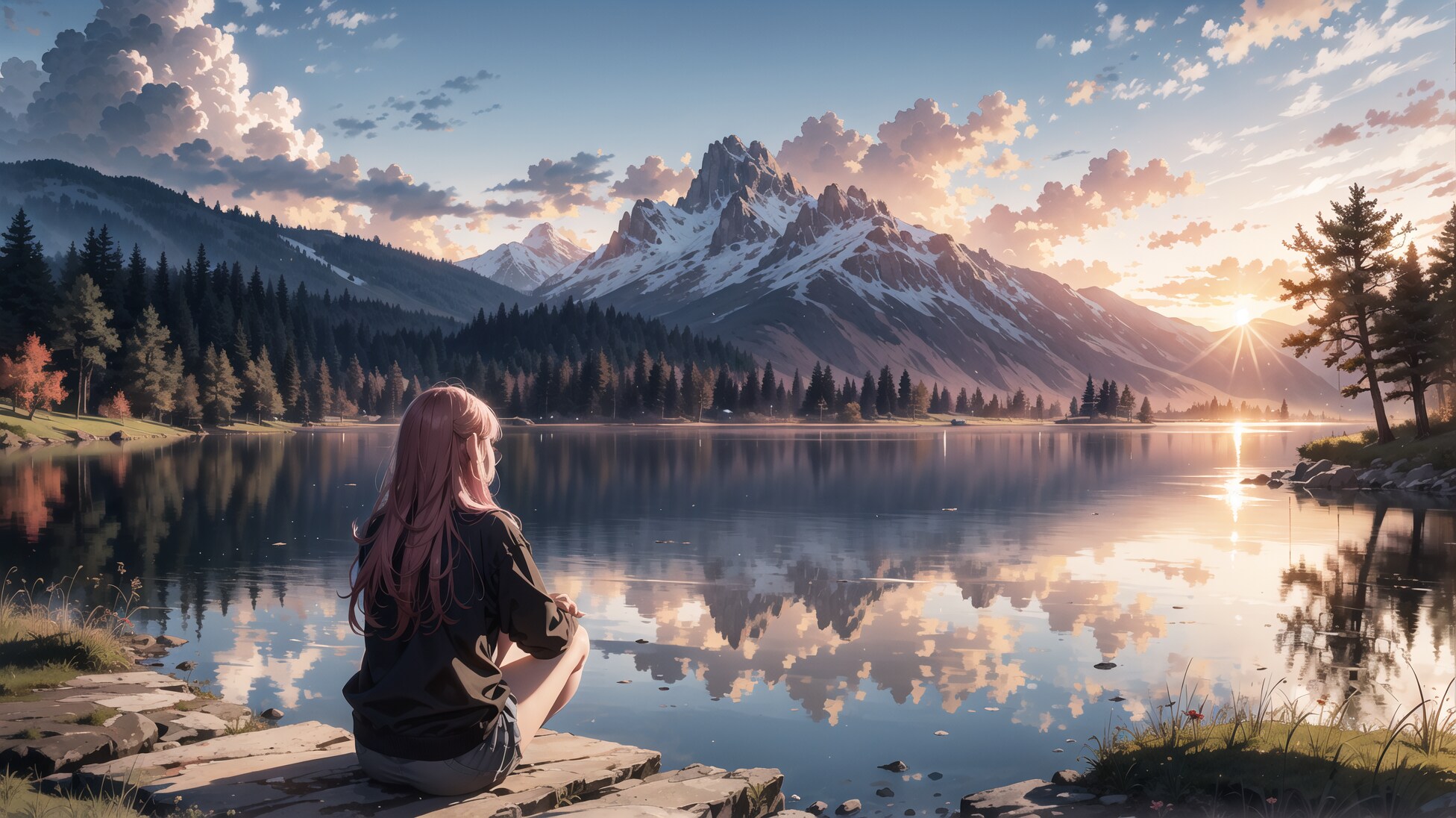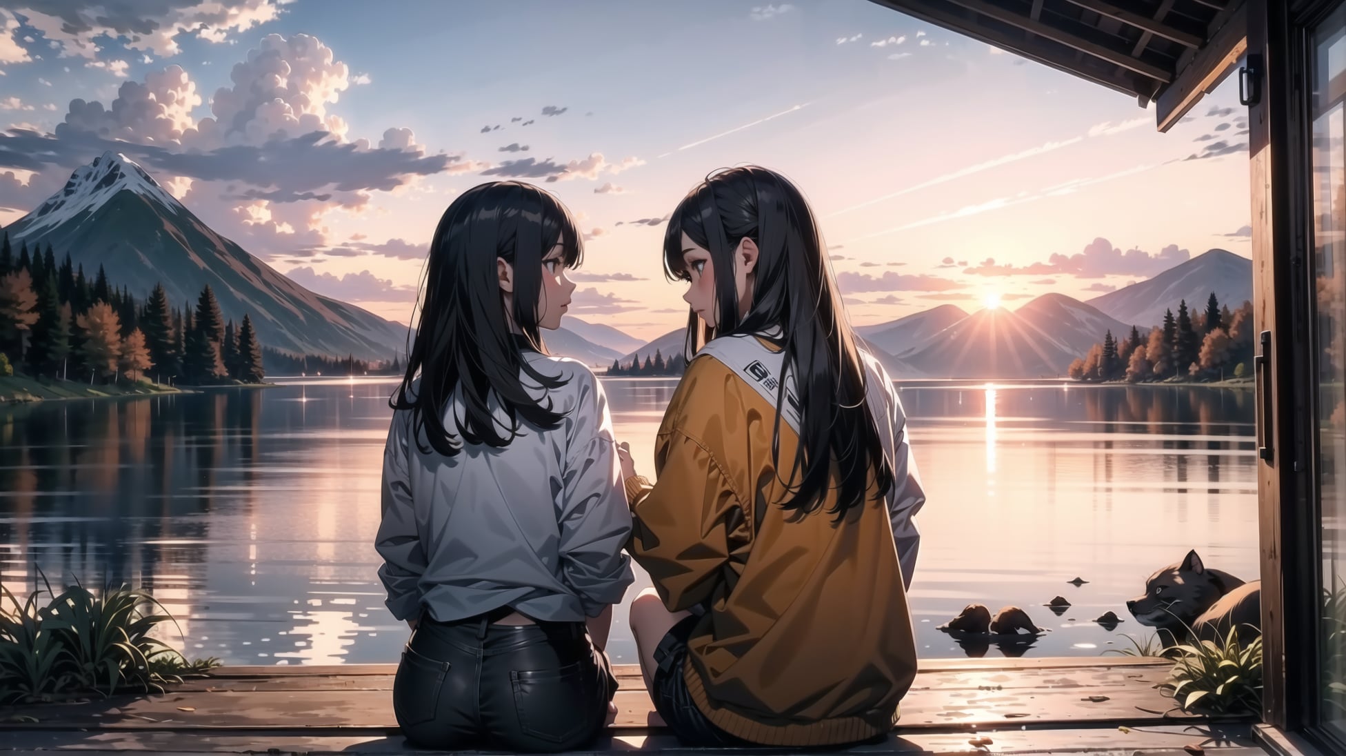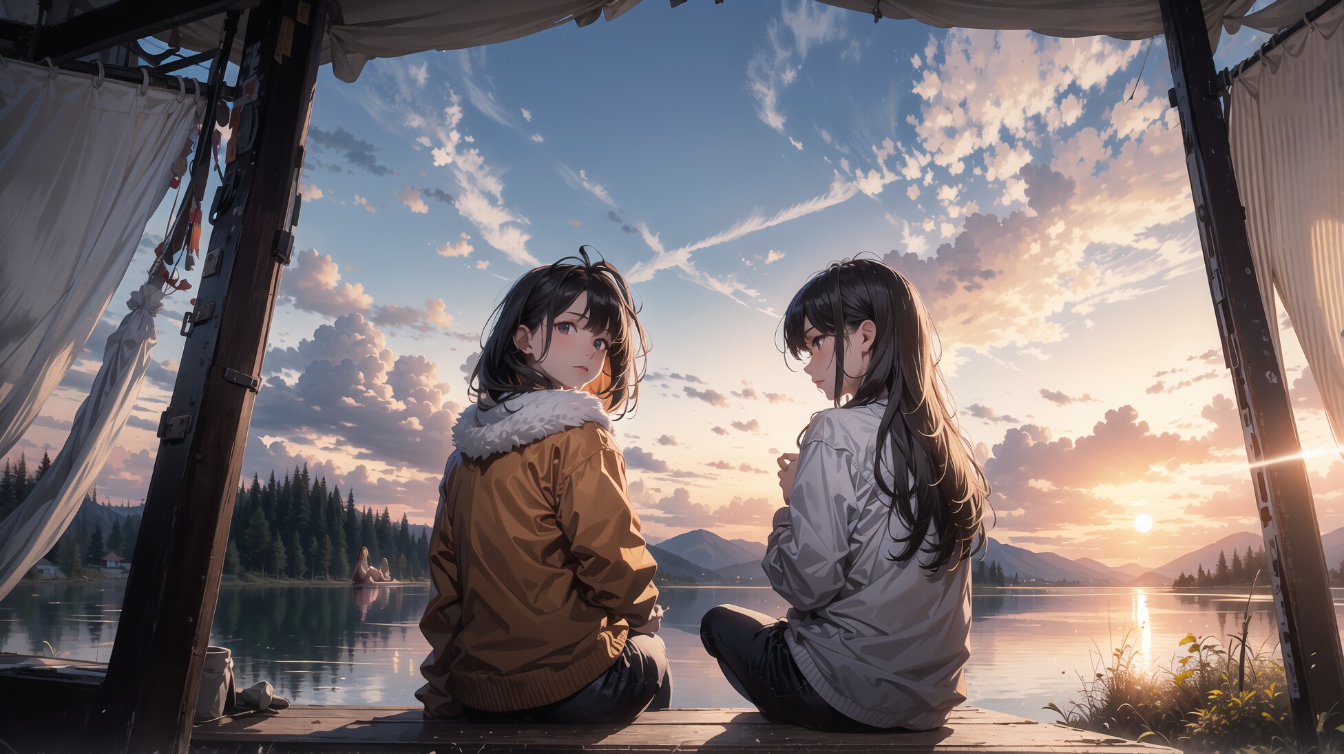 風光明美な景色と女の子達がキャンプしている絵を描きたかったのですが、キャンプというより別荘とかロッジとかに来た感じになってしまいました。。