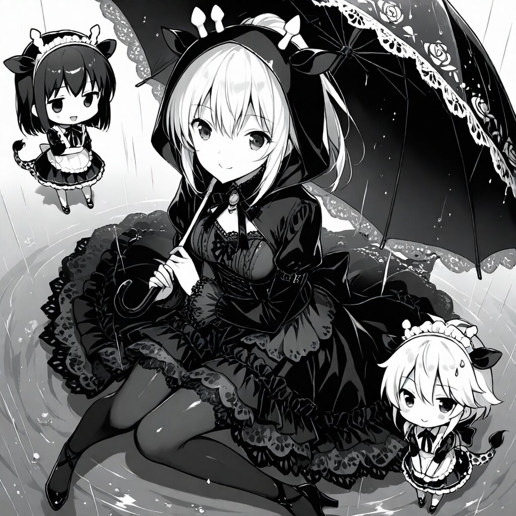 傘の裏地だけ青空で残りはモノクロでゴシックな世界を生成したかったんですが、うまくいきませんでした(╹﹃╹๑ )