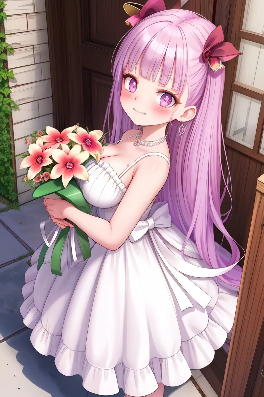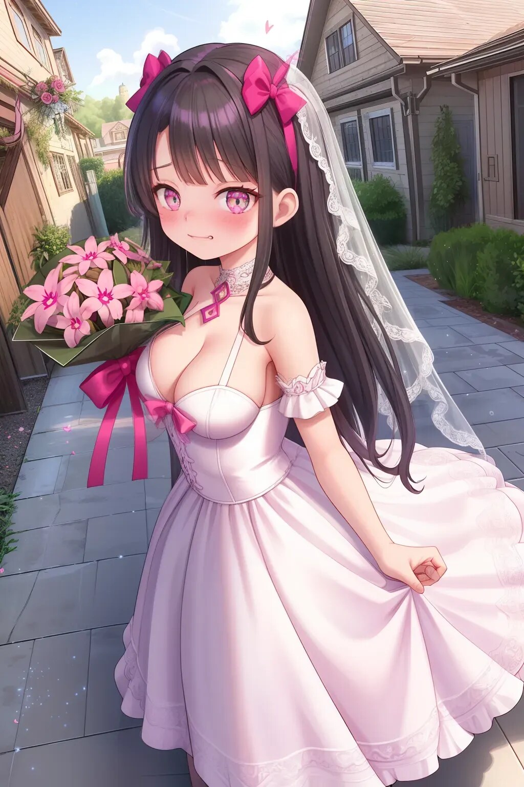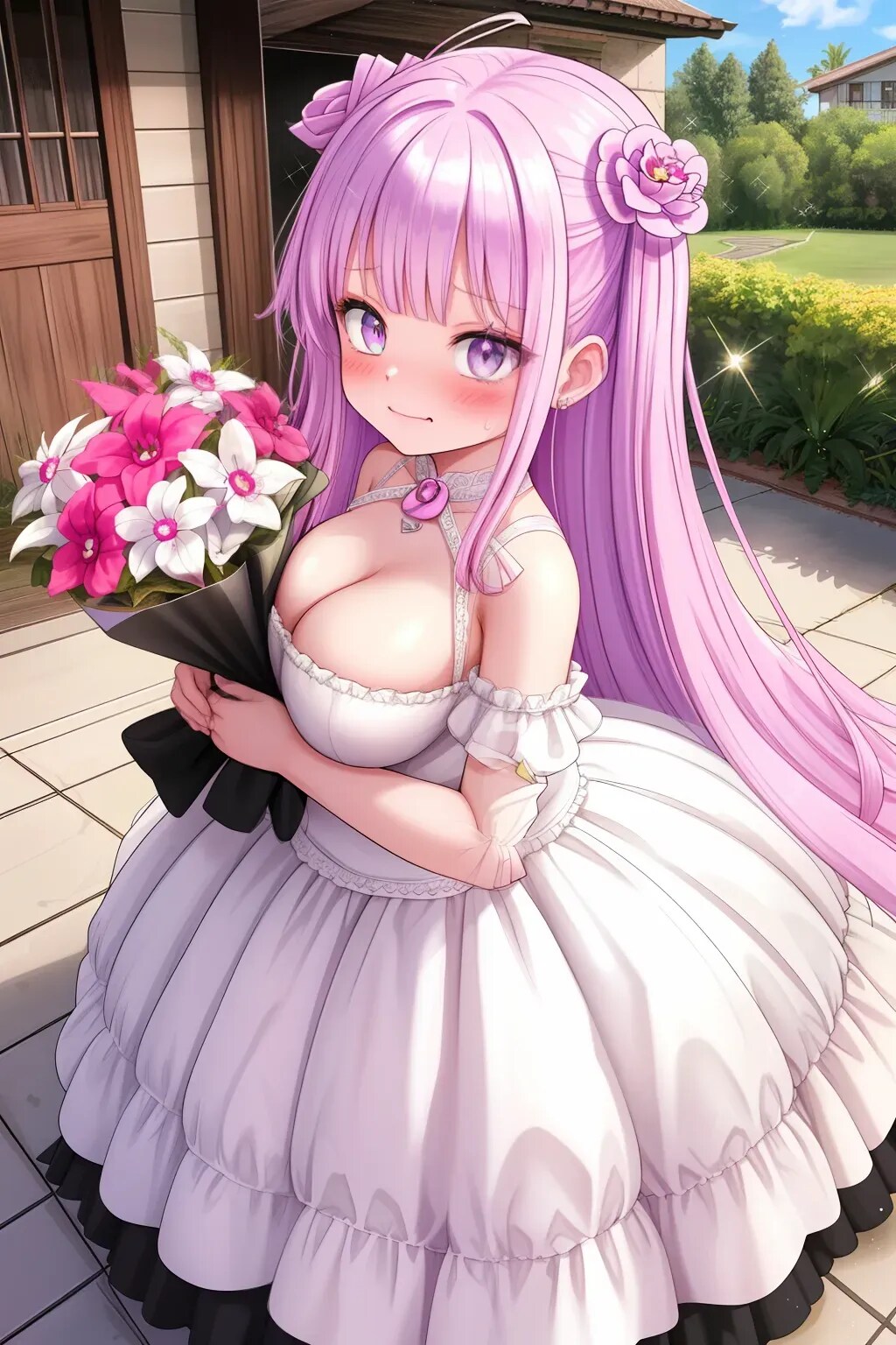 カトレア (?) の花束にウエディングドレスを着て迫ってくる