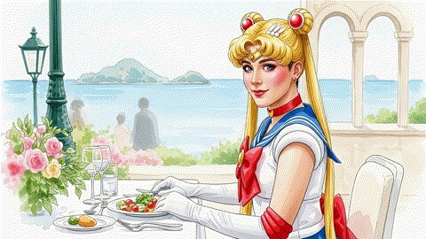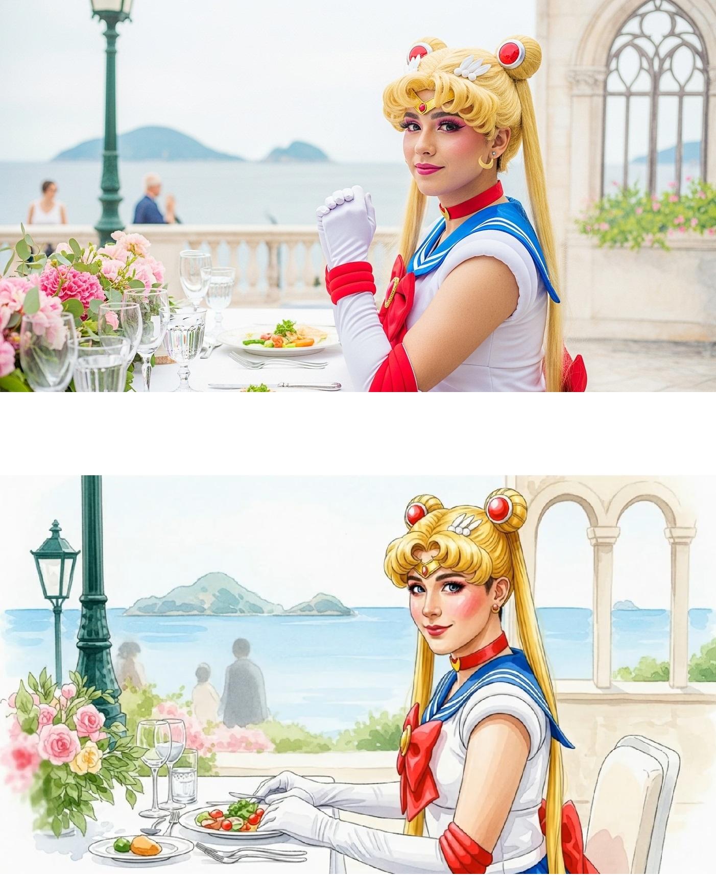 それにプロンプトを+で、こちらのような2枚のリアル画、アニメ画が作られます。