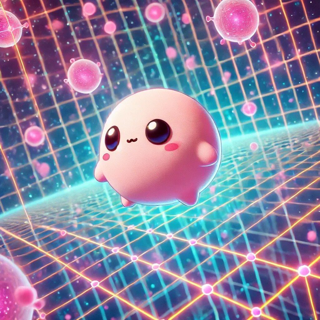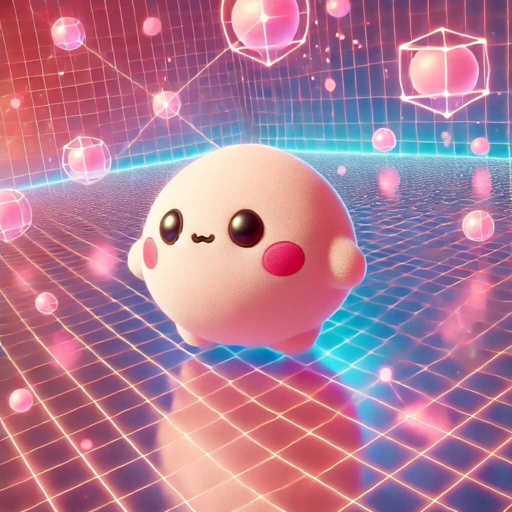 高次元の幾何学の中でも、ももほうくんはリラックスした様子で、どこか安心感すら与えてくれます。