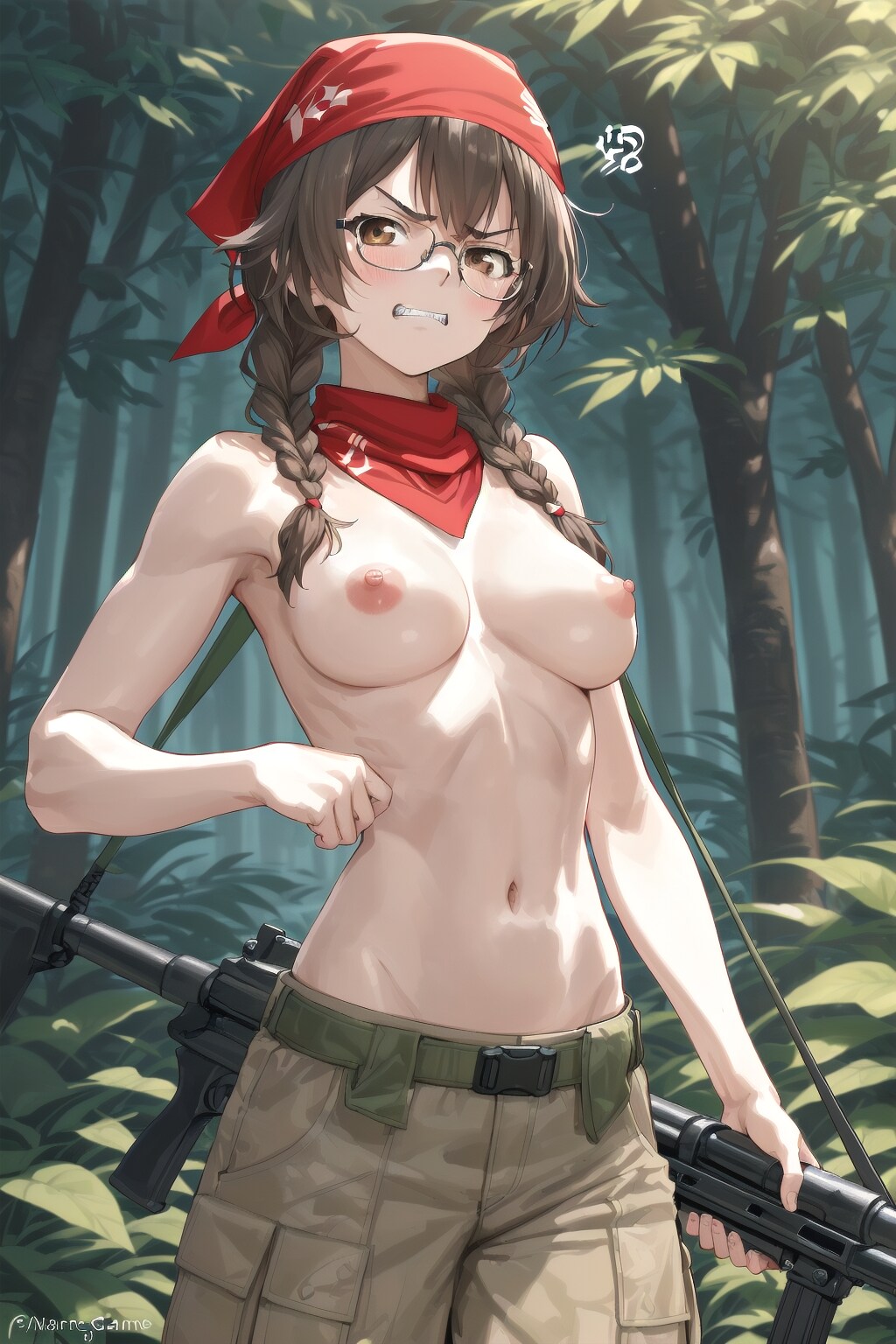 この投稿の原作のゲーム「怒-IKARI-」のプレイヤーキャラである格闘ゲームのKOFシリーズでもおなじみのラルフとクラークはこのゲームでは映画の「ランボー」シリーズばりの上半身裸。さきちゃんには申し訳ないとも思うけど、嫌な顔をさせるにはちょうどいい題材だったのもあって。初めてこの題材で作った時にはゲームでは裸でもこちらでは脱がすまい、と思ってたんだけどなあ(大汗)。