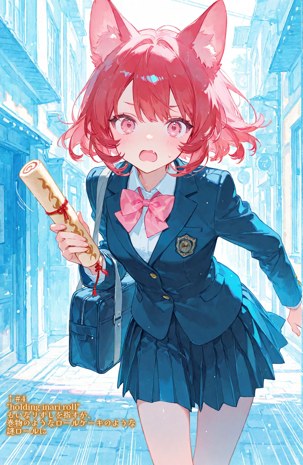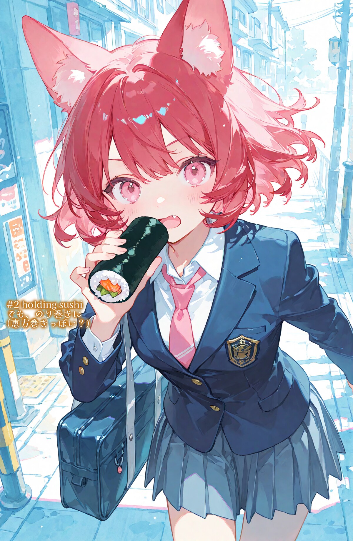 画像生成AIというのはすべからく人類が描いたことのある絵を機械学習して学んでいます。制服JKがパンを咥えて走ってくる王道シチュエーションを題材にした絵はそれだけ世の中にあまねく存在し、そして制服JKがいなり寿司を持って走ってくるというシチュエーションはそもそもレア過ぎて学習されていないようですね。😆