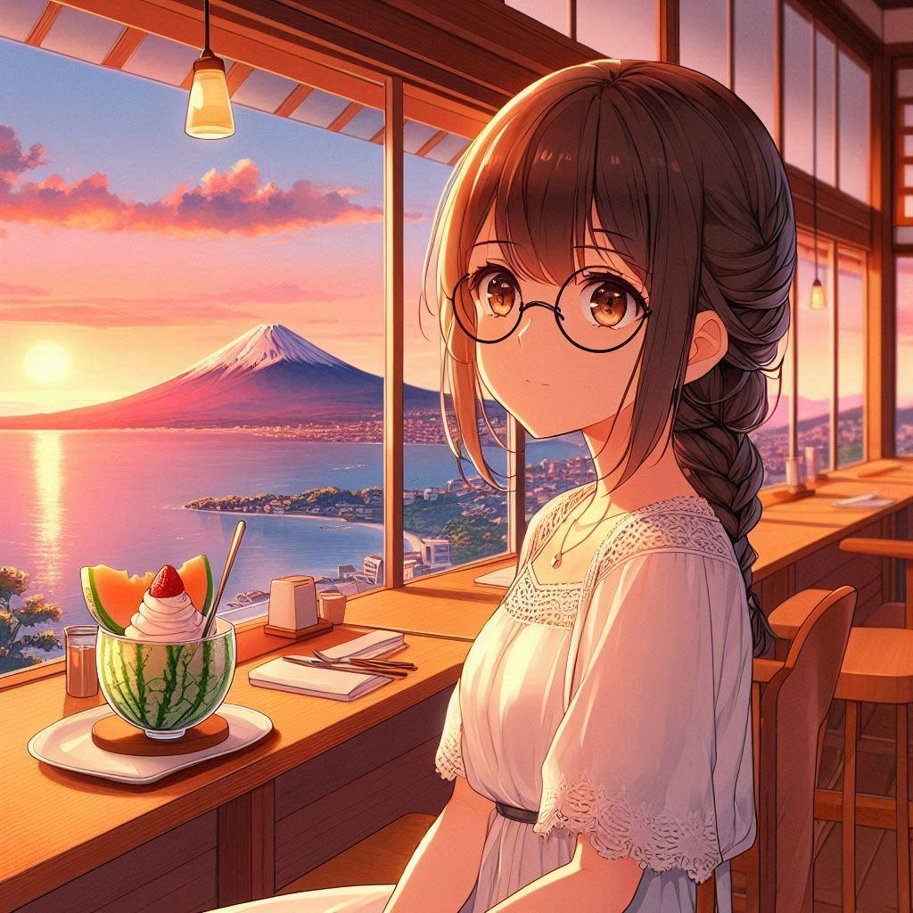富士山と海に沈む夕日の見られるレストラン……にしたいところですが方角が再現できませんでした😅