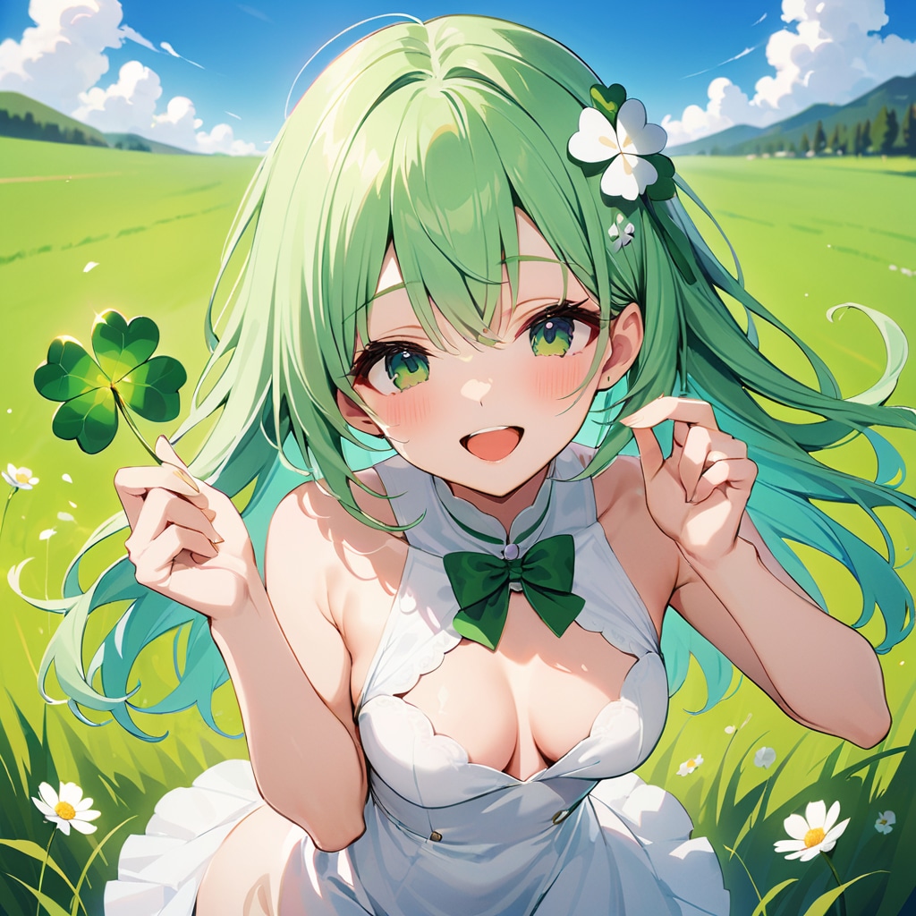 数字の4を意識して、草原でクローバーを持っている画像です。