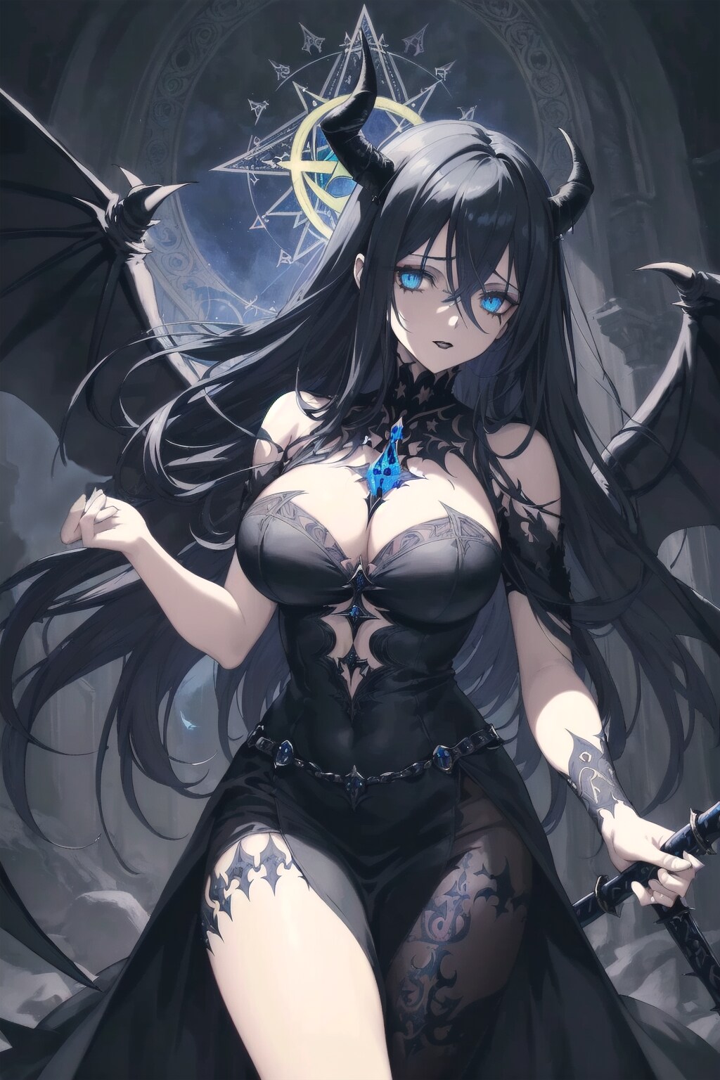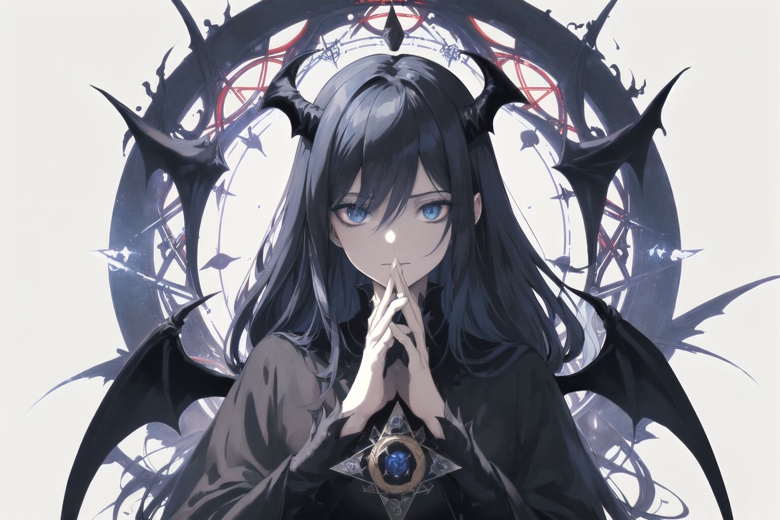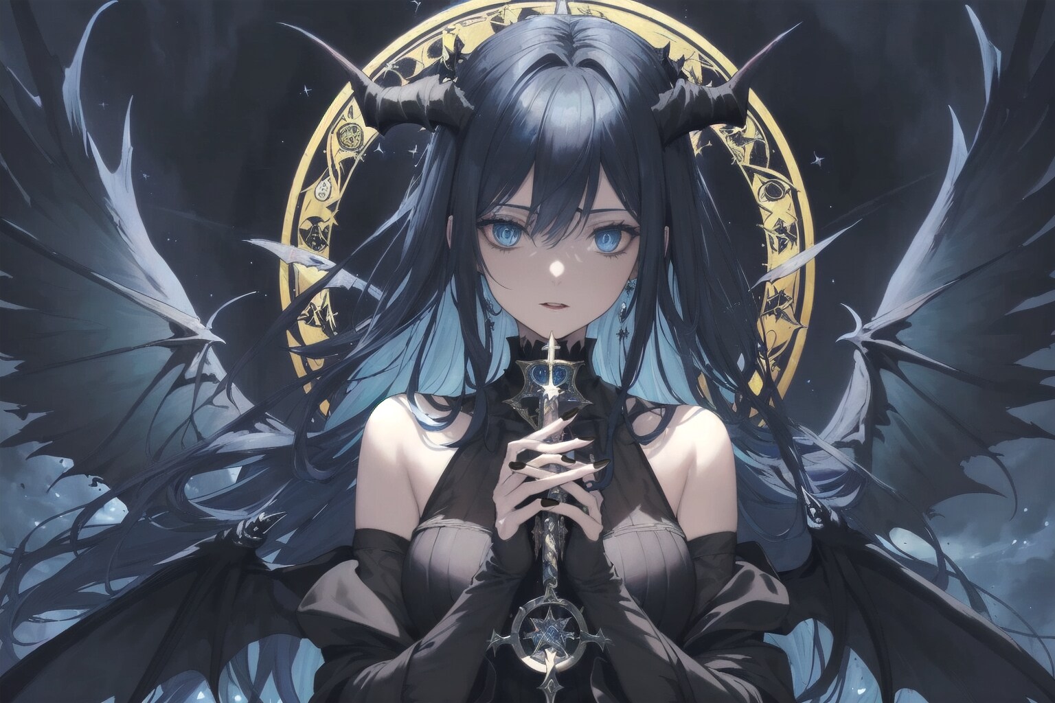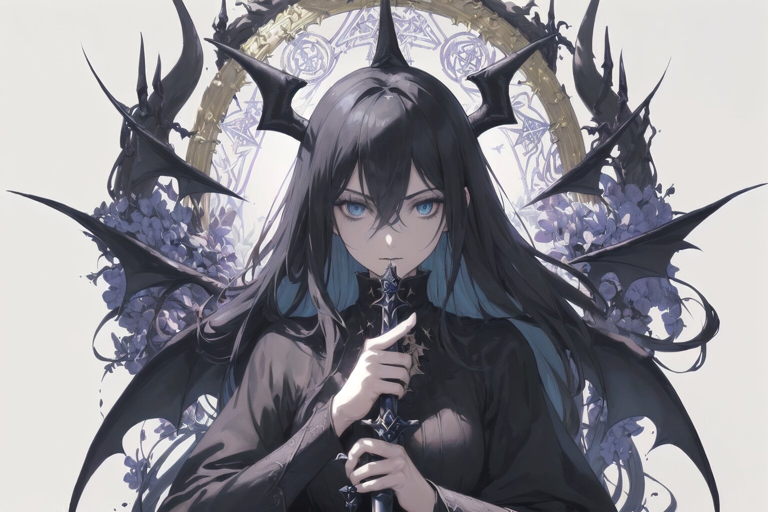 まず一体は召喚時に青みがかった黒髪に暗い濃赤の紅を引いた姿で現れ、完全形態では髪の青みが増し、羽は鳥のような悪魔の翼に変わり空を自在に飛び回って敵を斬り裂く。