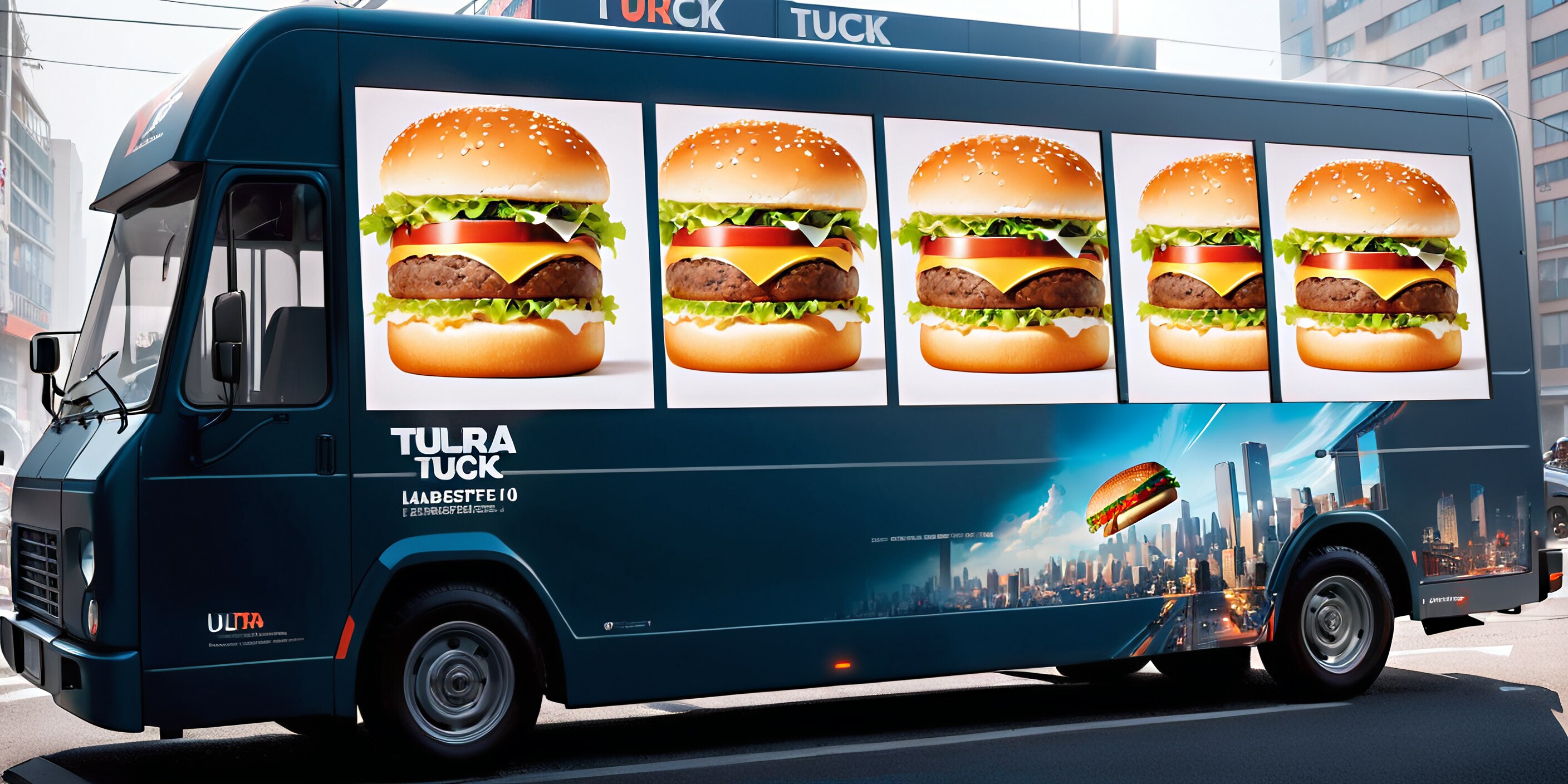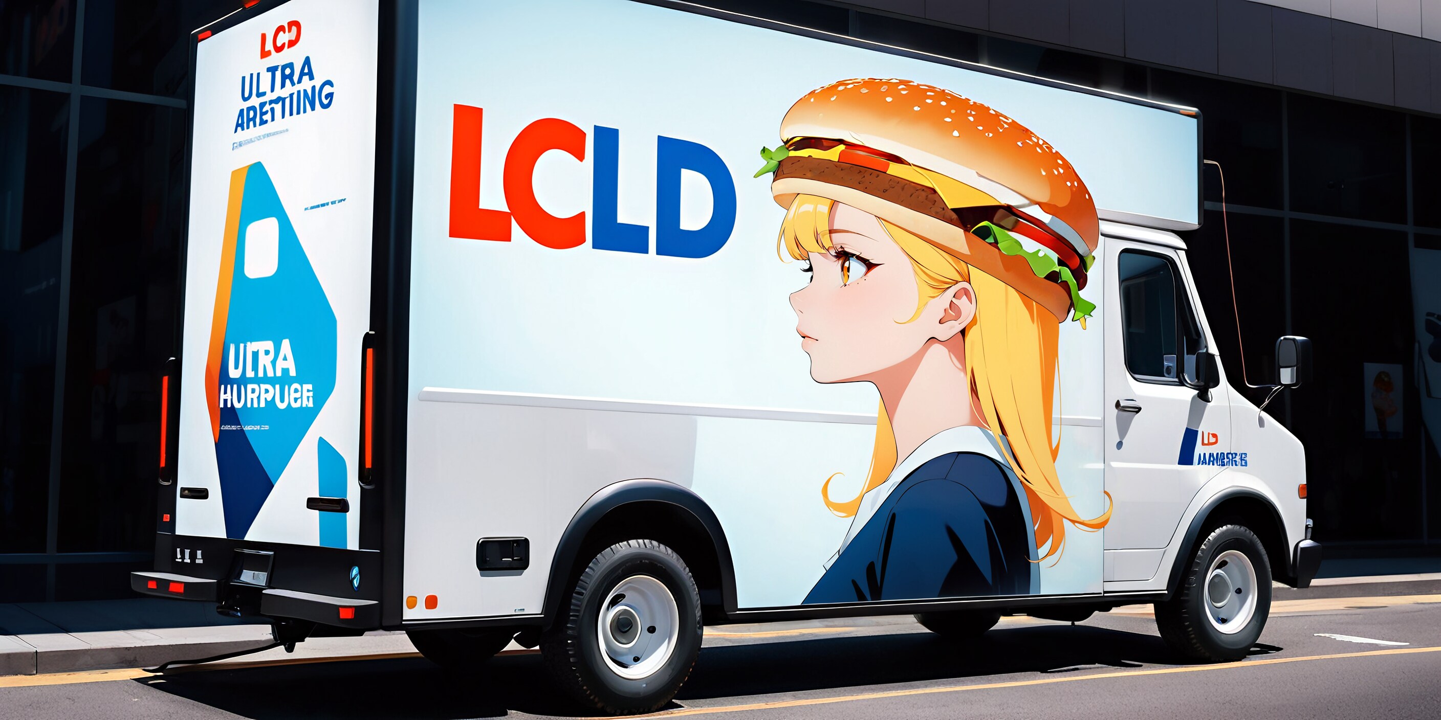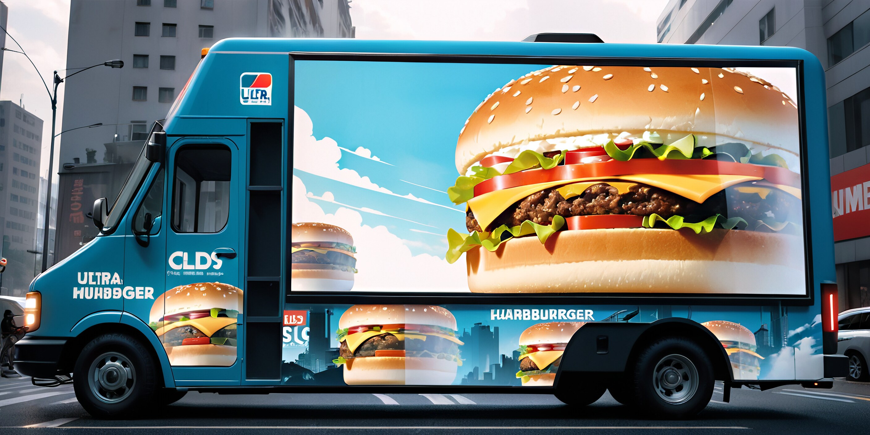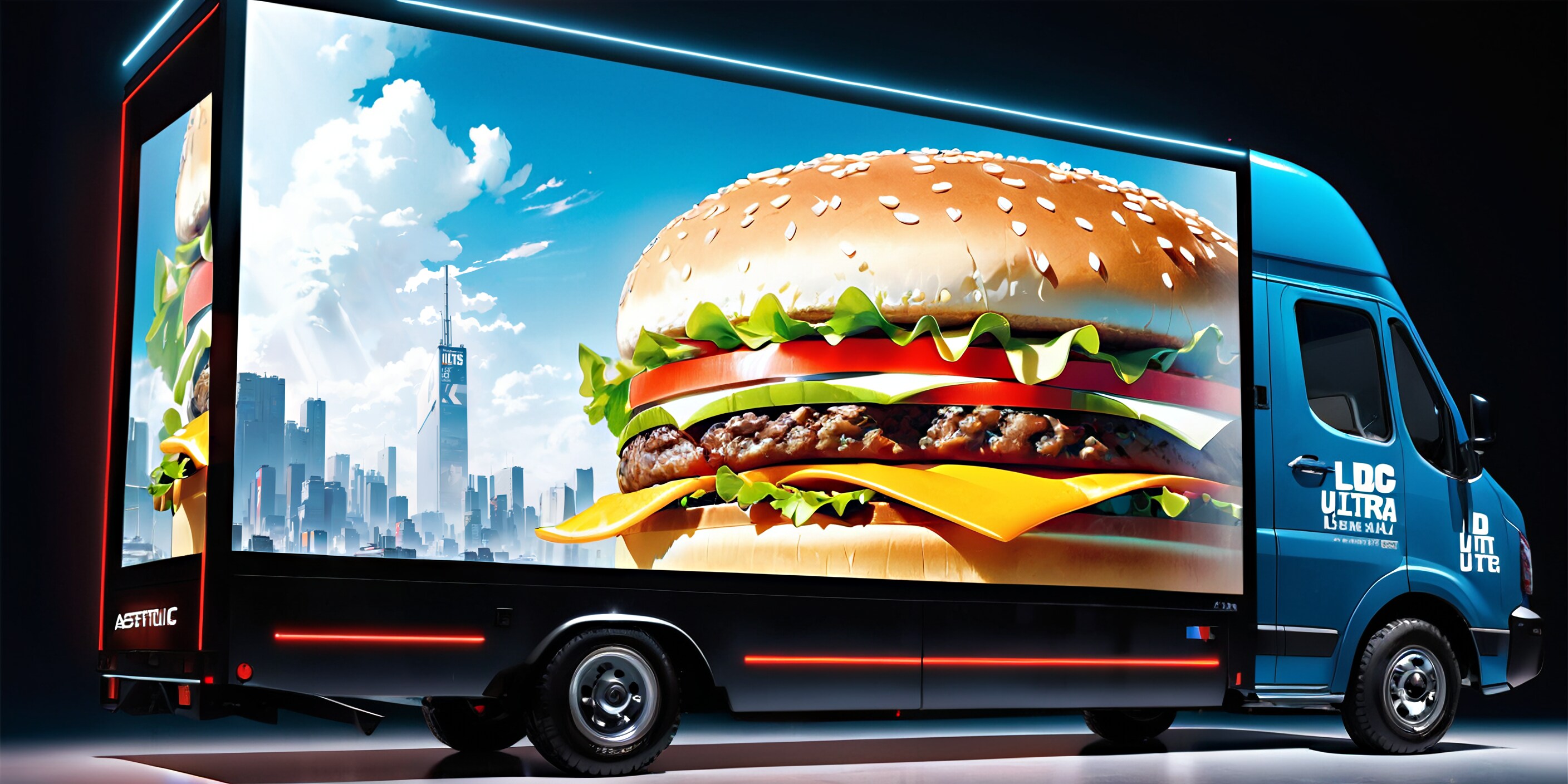 こちらのプロンプトをお借りして、ハンバーガーの宣伝カーを作ってみました。
