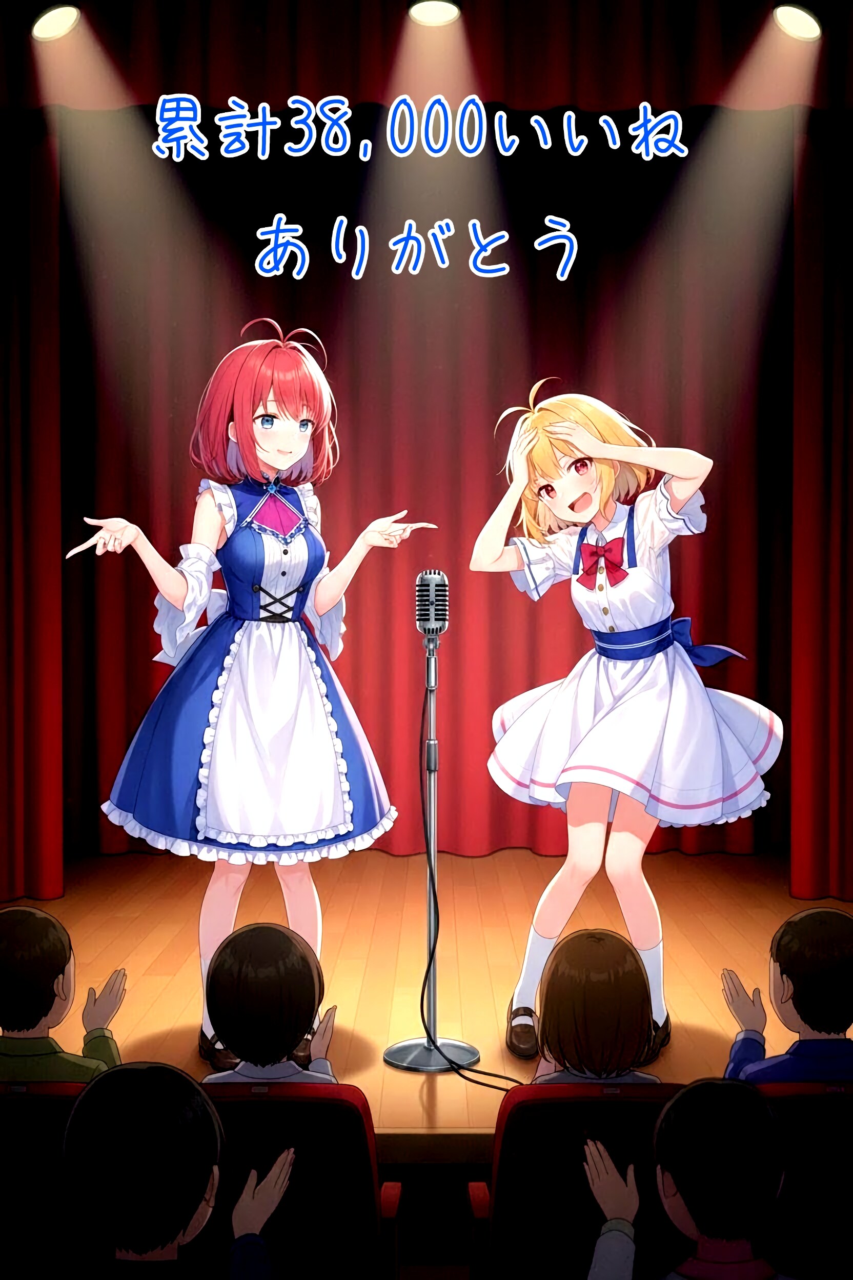 今回は38,000の数字から「サンパチ」と言うことで、サンパチマイクの前で漫才するナツミとカエデのネタでどうぞ。