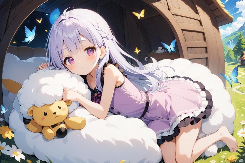 メルヘンチックで幸せそうなことをプロンプトに入れました。羊型ベッドが特徴です。