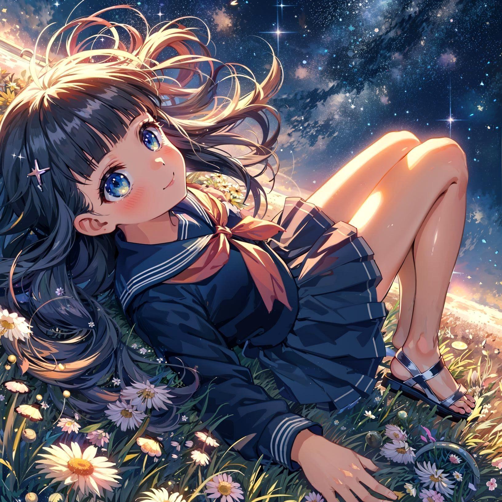 夜の帳が静かに町を包み込む頃、彼女はいつものように花畑に横たわっていた。まるで宇宙の一部になったかのように、星々が彼女の長い黒髪に絡みつく。瞳には無数の星が映り、その一つ一つが彼女の心に小さな物語を語りかける。