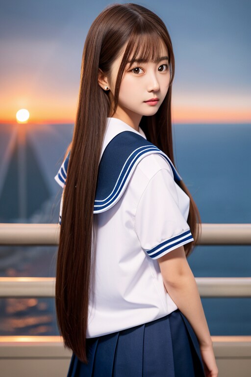 かわいいセーラー服の女の子 夕日の橋の欄干