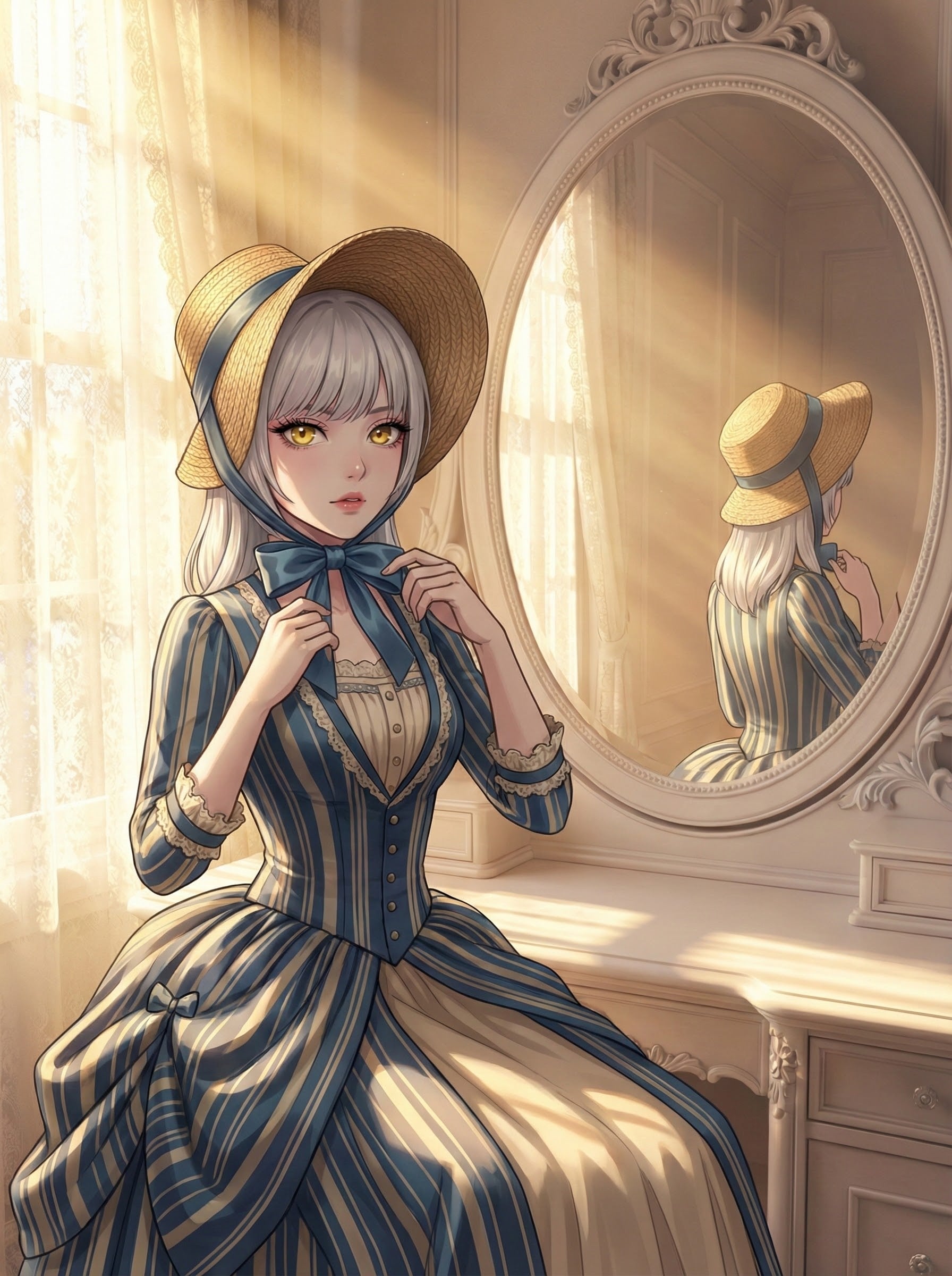 ・Fashion: 「Late Victorian (1880s)」のシルエットをベースに、「Poke Bonnet (ボンネット)」と「Walking Dress」を構造的に再現しました。
