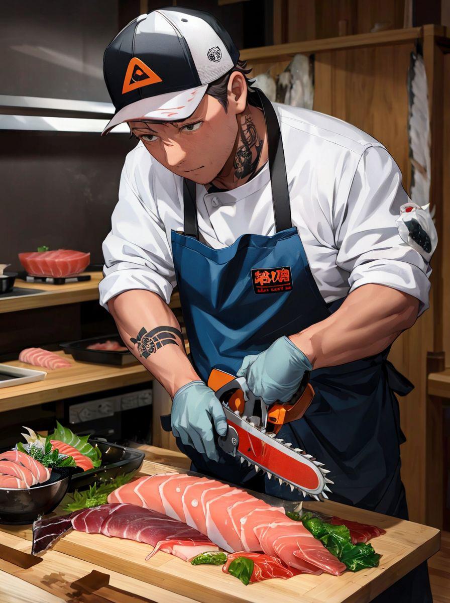 チェーンソーで刺身をさばく職人