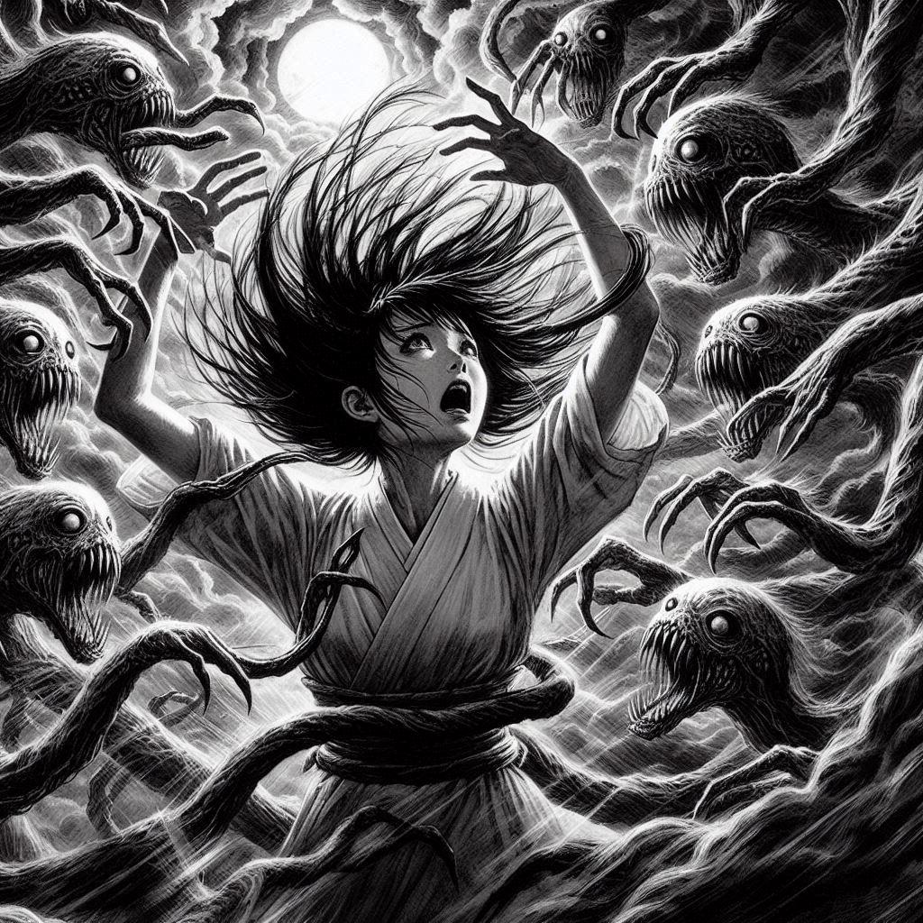 命ある生者達を憎み妬む亡者達の怨念が、やがて具現化し形ある邪悪な負の感情(オーラ)として生者達にまとわりつく💦!って脳内設定のイラストです。