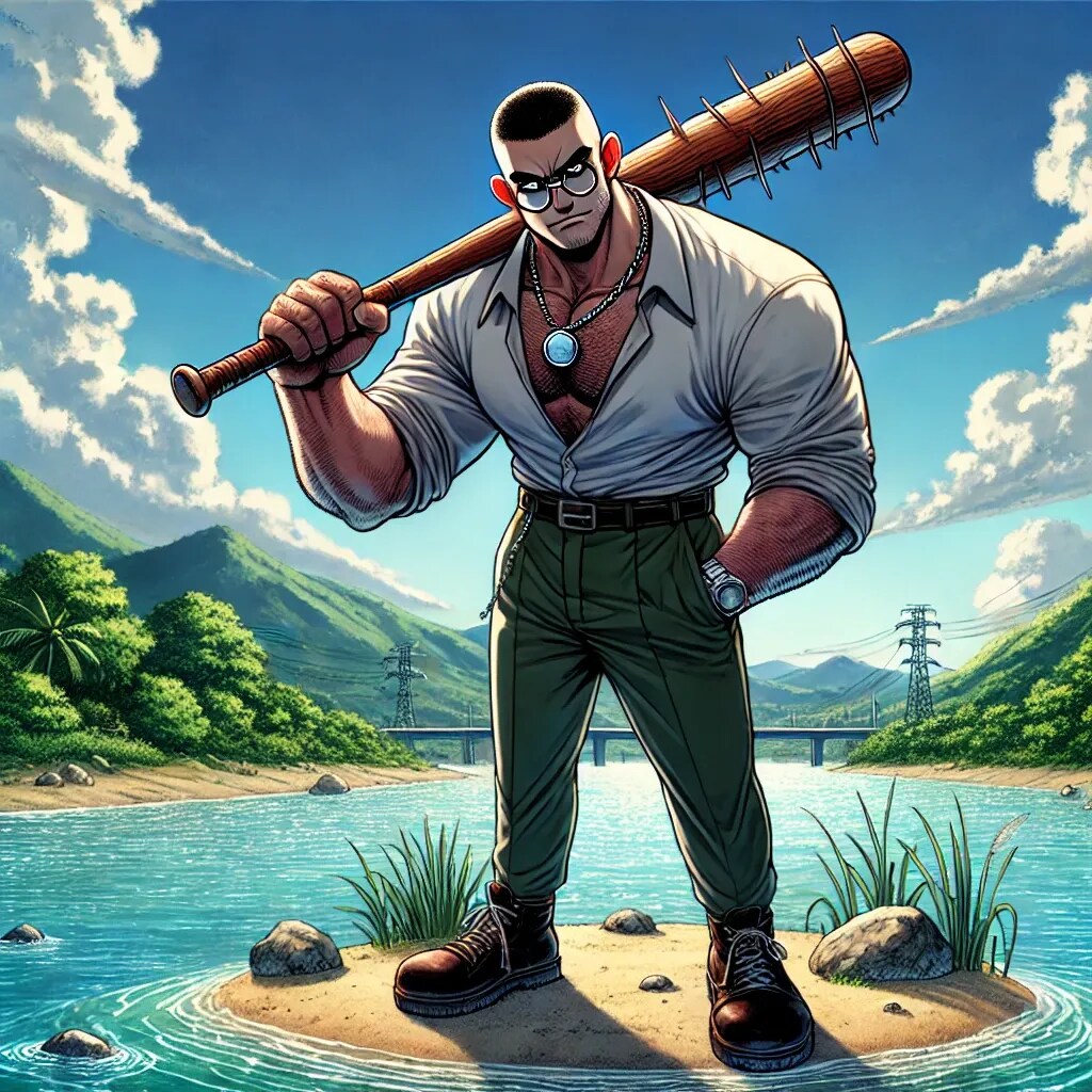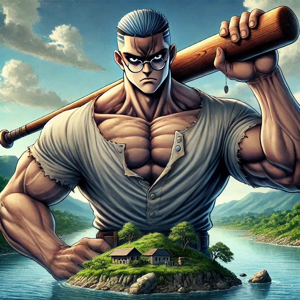 川の中島に孤独に立ち尽くし、木製バットを構える剛腕の戦士。