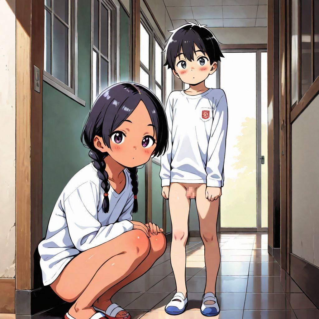 男の子たちもシャツだけ着て下半身は丸出しで、ちんちんが露出しているのを恥ずかしがっている。