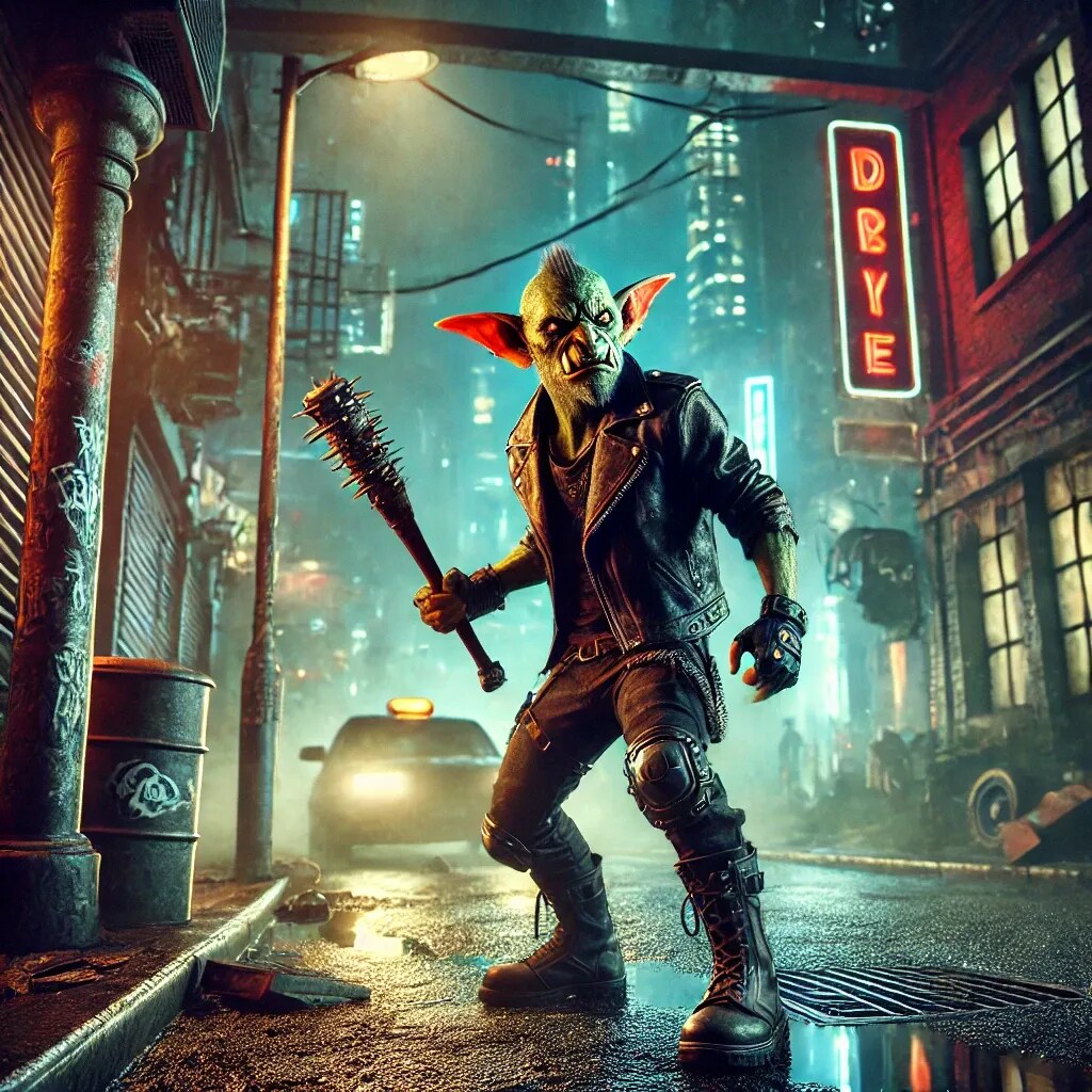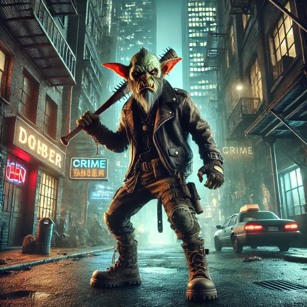 武装したゴブリンが現代風の暗黒街にいる様子が描かれています。