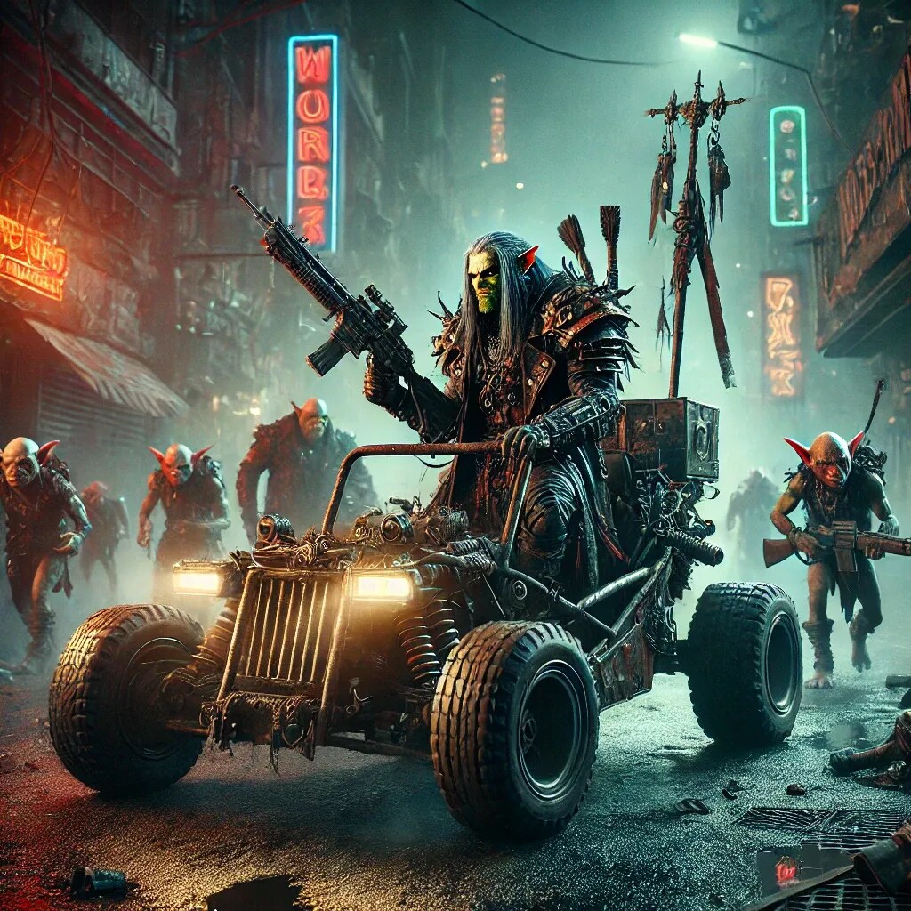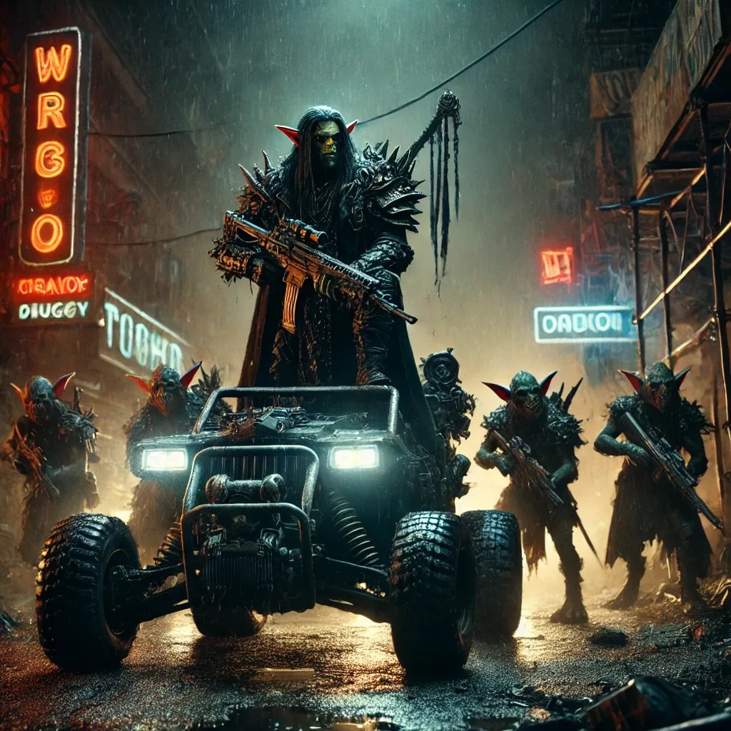 武装バギーに乗ったゴブリンのリーダーが、取り巻きを従えて暗黒街を支配している様子が描かれています。