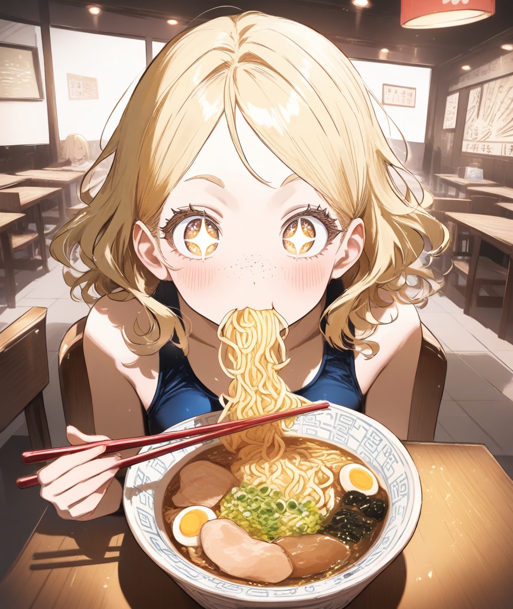 ってことでスク水モールのフードコートでラーメンをずばずば食べて(`・ω・´)シャキーンしている様子と