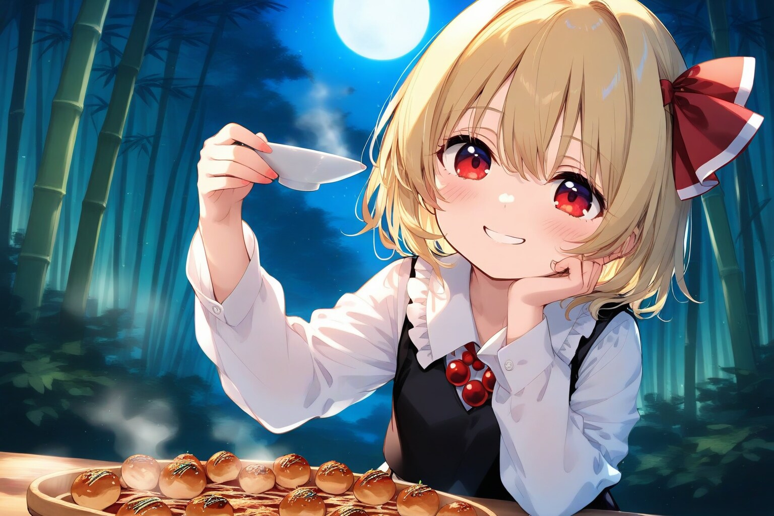 因みにプロンプトではたこ焼きで出してますが、イメージ設定的には夜雀の屋台で吞んでいる感じなのでたこ焼きじゃなくてヤツメウナギ焼きですね。