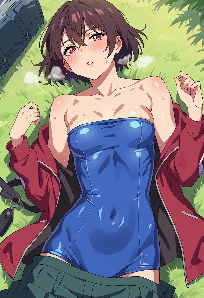 jacket partially removed, heart in eye, burnt clothes, holding fishing rod, kanji, doujin cover, pentagram, tape gag, adjusting headwear, red socks, friends, cloud print, coke-bottle glasses, oral invitation, competition school swimsuit, barbell piercing, gradient legwear, prisoner, blood on breasts, wind chime, carrying over shoulder, tape measure, flaming weapon