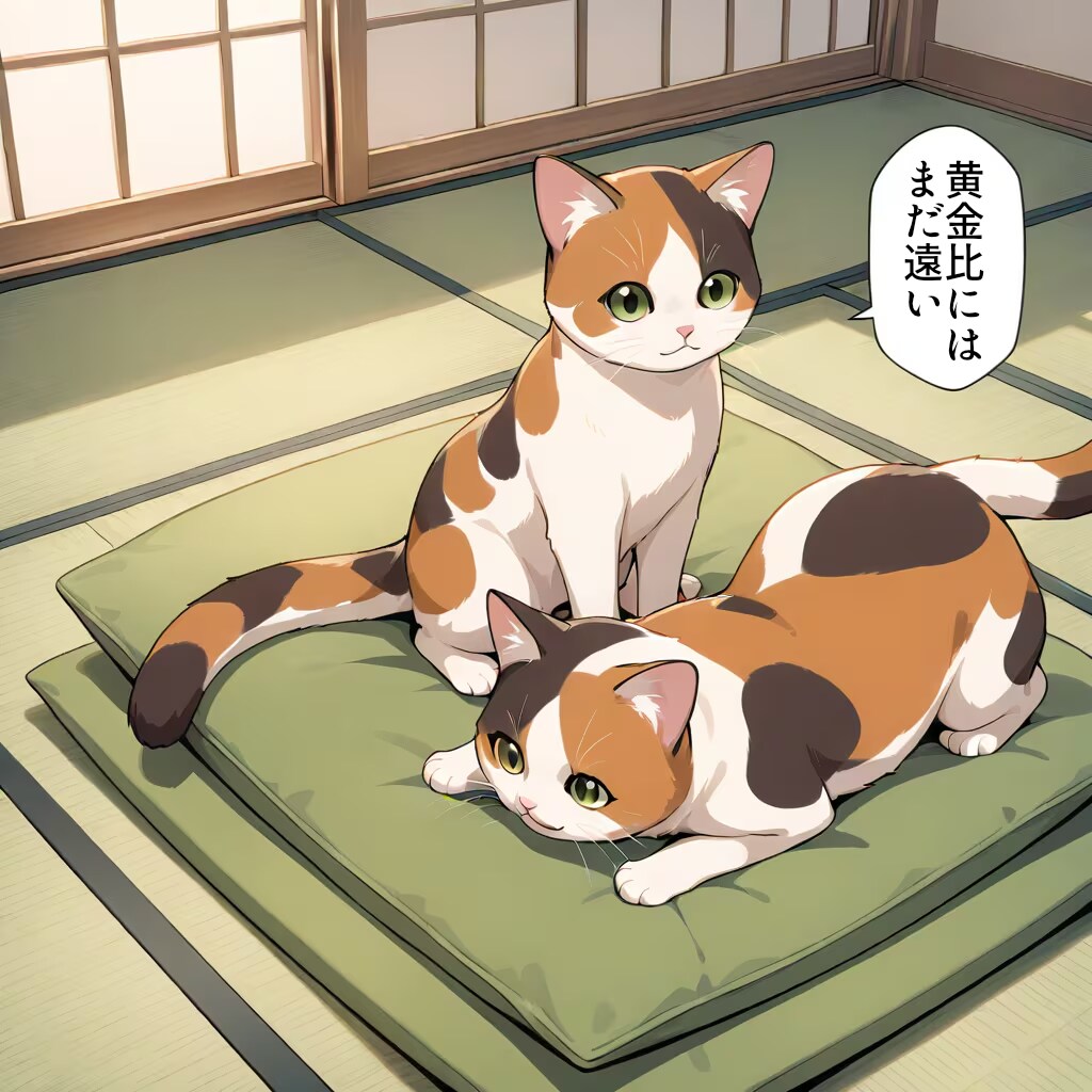 「まねき猫さんの【二匹の三毛猫】の吹き出しの空白に文字を入れました」