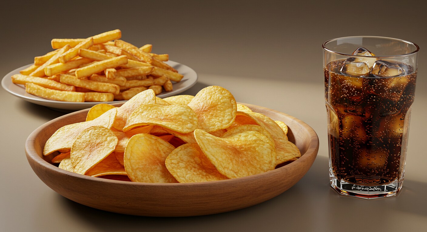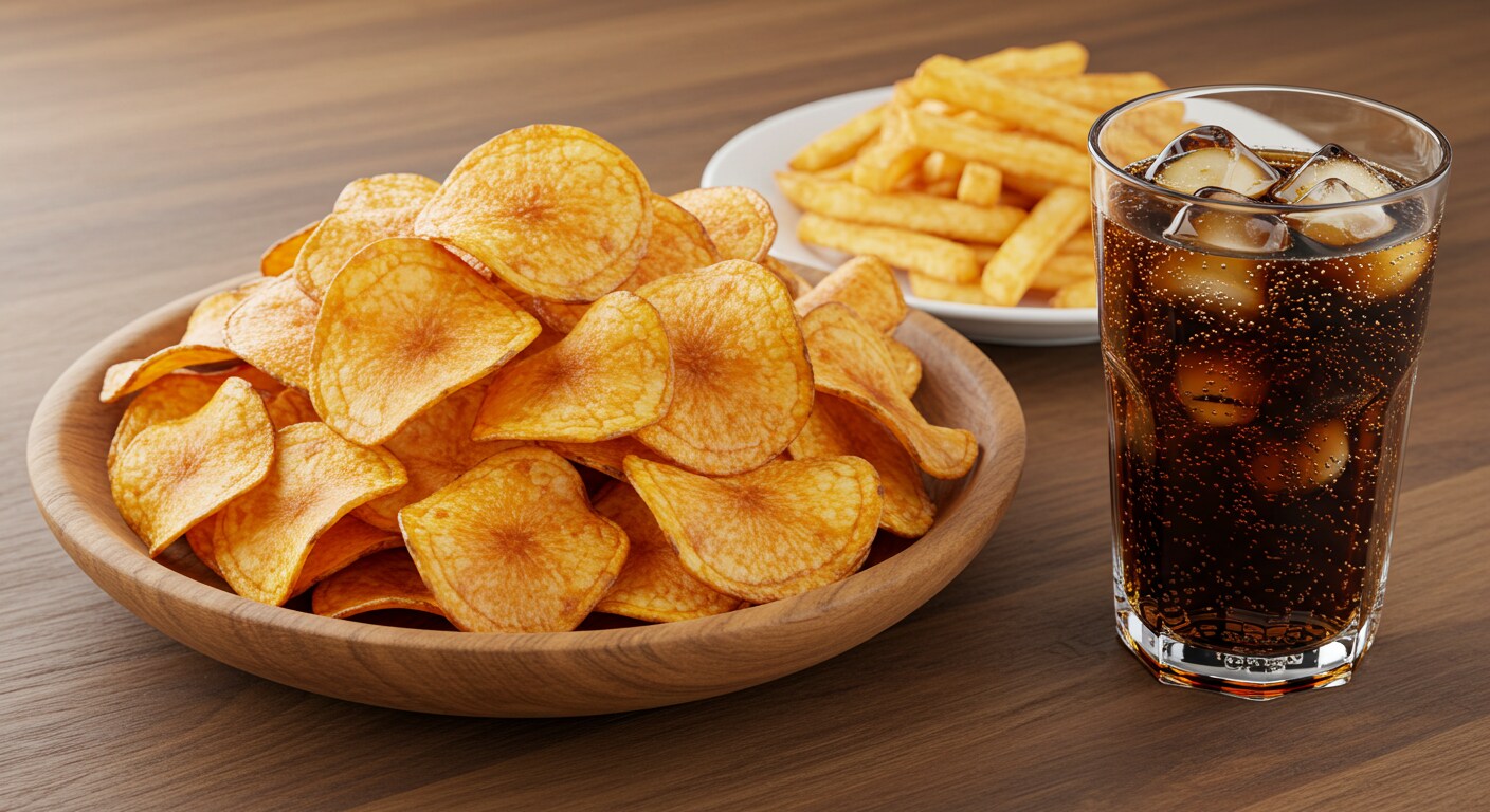 深夜のポテトチップスとフライドポテトとコーラのセット
