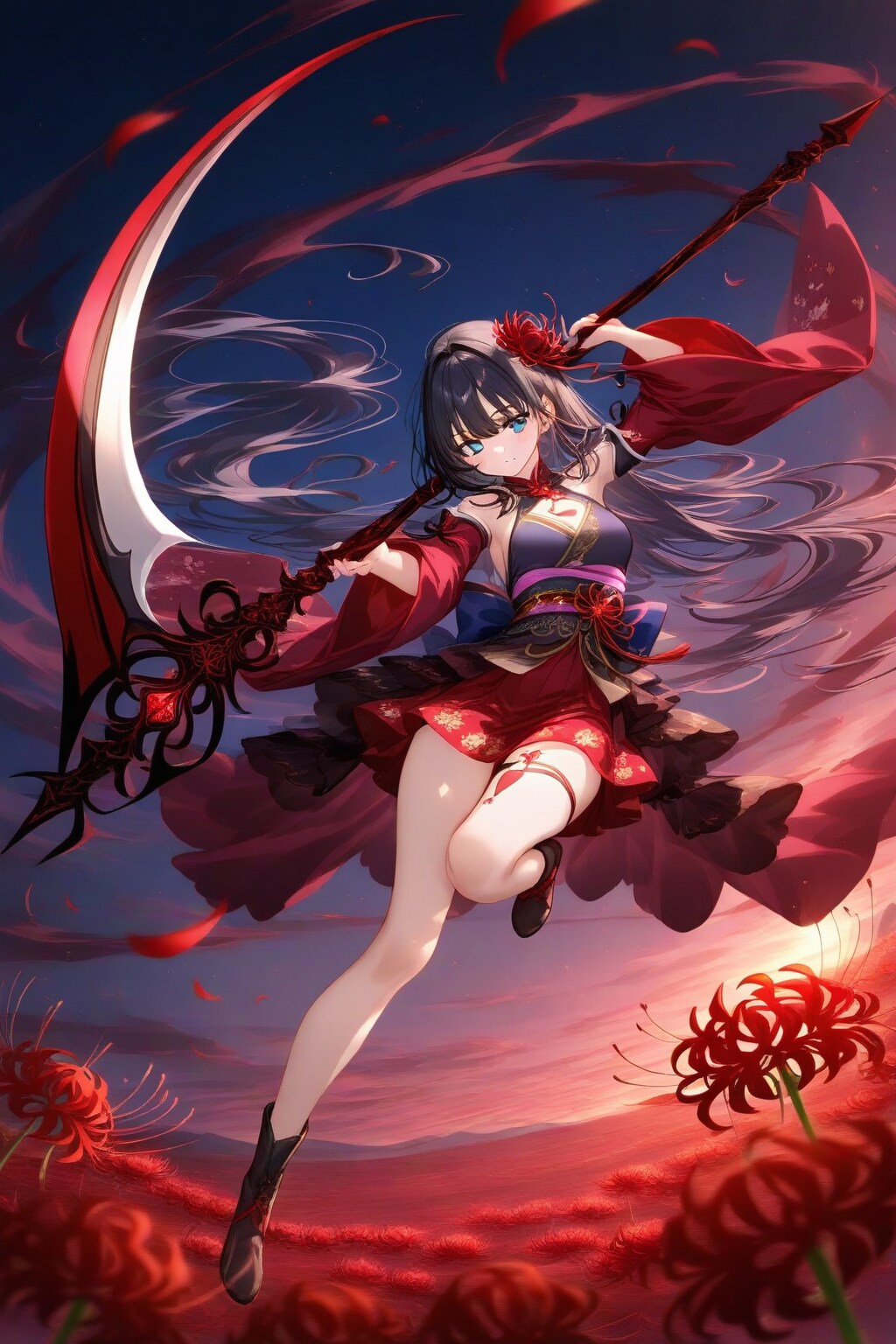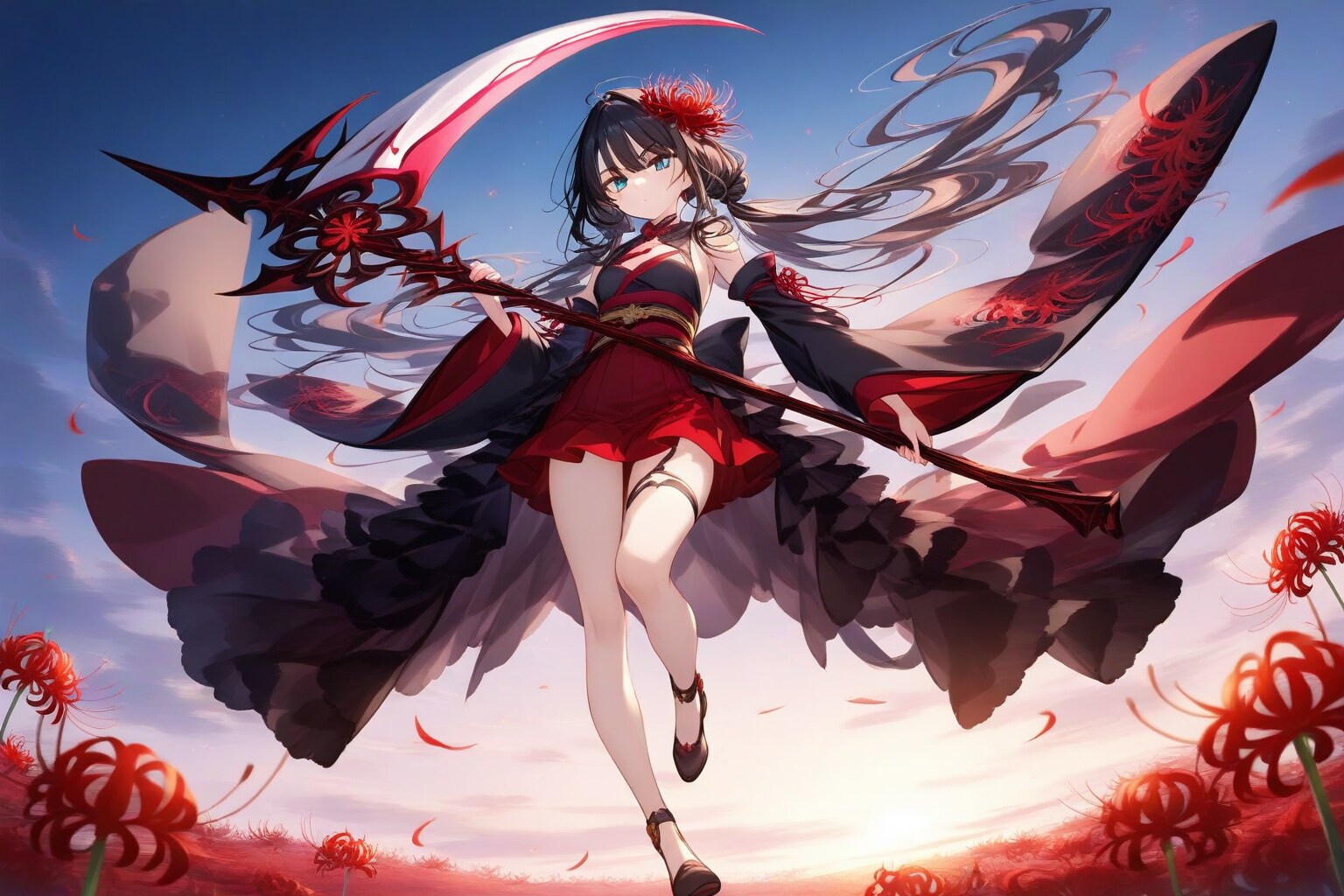 プロンプトに「spider lily」で曼珠沙華を生成できる事を勉強したので、曼珠沙華モチーフの魔法少女的な物を作ろうとしたら、明らかに死神の様な雰囲気になってしまったw