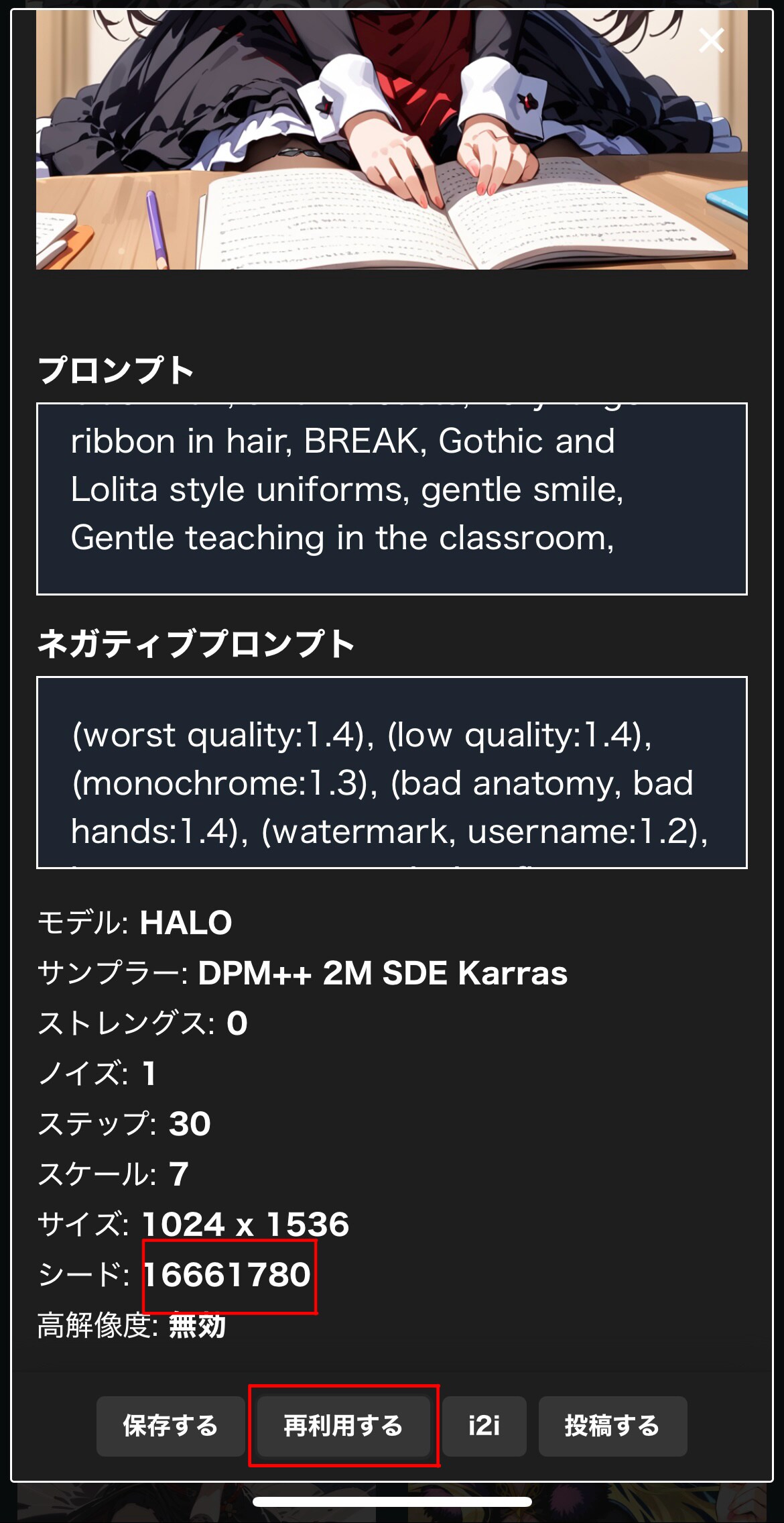 すると再利用ボタンから、編集が楽に感じます❗️再利用すると、プロンプト以外も設定されるので注意⚠️